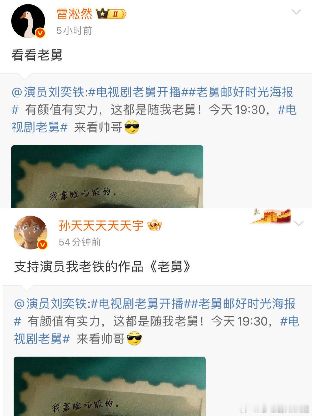 刘奕铁摇来了多少喜人啊 谁还没发现刘奕铁在喜人圈的好人缘!新剧一播,雷淞然、孙天宇这些熟面孔全来评论区撑场面,连之前合拍过的张呈也有互动,私下一起玩、剧播一起应援,这人脉真的绝,对《老舅》期待值直接拉满