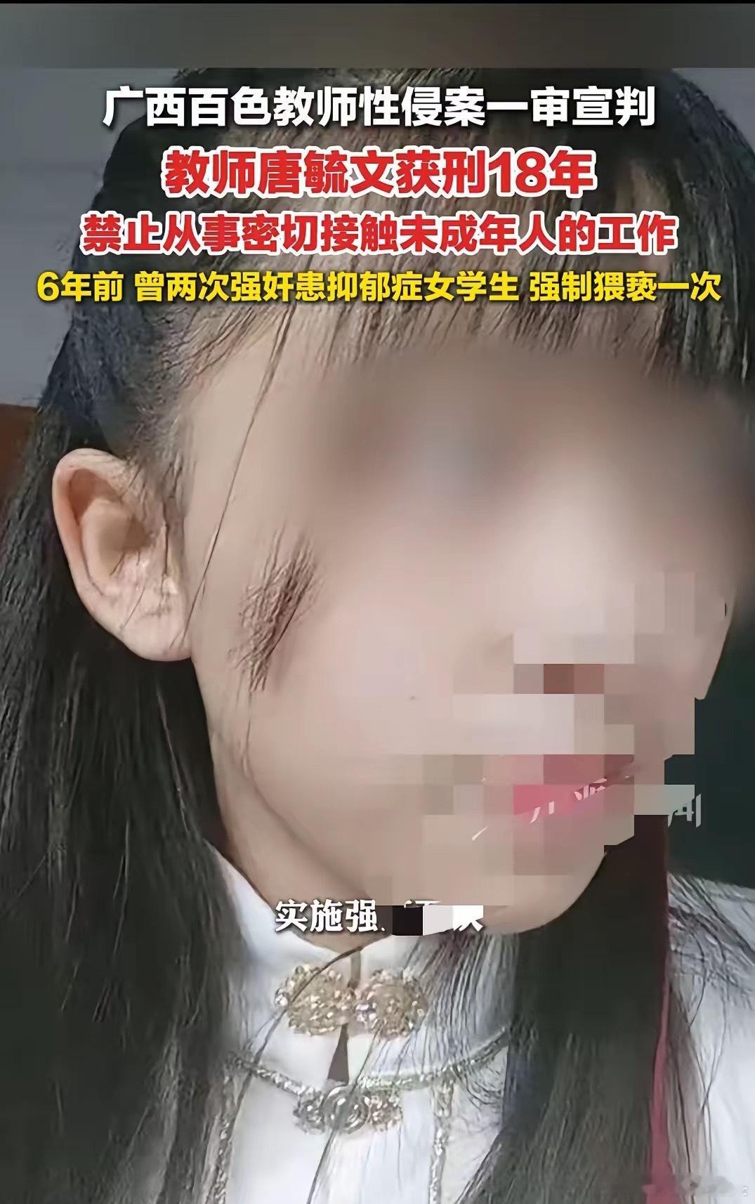 广西,重度抑郁的女孩选择自 杀,三位堂姐清理遗物时,竟发现她被班主任长期性侵、言语威胁!更让人心寒的是,她曾在班级群讨要说法,群聊却被直接解散——这份求助无门的绝望,最终把她推向了不归路。三位堂姐誓要讨回公道,举报之下,施暴老师终受严惩,女孩得以安息。2025年1月17日,广西百色的电话铃声打破午后宁静。三位堂姐接到消息时,22岁的符月华已永远离开人世。这个2002年出生、曾以全县中考第一考入百色祈福高级中学的女孩,最终在家中烧炭自杀,留下遗言:“亲爱的朋友,我已归家。”赶到表妹家,眼前是悲痛欲绝的亲属和寂静的遗物。谁也没想到,整理遗物的举动,让她们踏上长达10个月的维权路,一桩尘封多年的校园性侵案就此浮出水面。符月华成长于离异家庭,性格敏感内向。三位堂姐从小疼爱她,看着她凭借天赋与努力考上重点高中,却不知从2017年9月高一入学起,表妹的人生已被班主任唐毓文彻底摧毁。唐毓文并非普通班主任,他身兼校学生发展中心主任、年级组长等职,还是多次获教育部门嘉奖的“优秀班主任”,光鲜履历下藏着禽兽之心。整理遗物时,堂姐们发现了符月华的日记、旧手机和电脑。日记里,她用颤抖的字迹记录着2017年至2021年的屈辱:唐毓文以“补课”“谈心”为借口,多次在办公室、私家车内、她的住处对其实施强奸和猥亵,还以“毁你名声”“没人会信你”持续威胁,甚至发送“我想做爱了”等露骨信息;电子设备里的聊天记录,让三位堂姐气得浑身发抖,也终于明白表妹高二起成绩波动、出现自残倾向,2019年确诊重度抑郁症的根源。这段创伤让符月华痛苦不堪,2020年高考前,她竟撕毁准考证放弃考试。但她并未放弃人生,2021年复读后,她以628分的县理科状元成绩考入华东师范大学物理系。可阴影从未散去,2021年10月,她被诊断为“伴精神病性症状的重度抑郁发作”,只能休学治疗;2022年10月,病情加重为精神分裂症,2023年9月无奈退学。2023年,走投无路的符月华曾在高中毕业班级群揭露唐毓文的恶行,贴出聊天记录痛斥他是“衣冠禽兽”,却被唐毓文解散群聊,还教唆部分学生指责她“抹黑老师”,彻底切断了她的求助渠道。“不能让月华白死,一定要让坏人付出代价!”悲痛过后,三位堂姐决心维权。作为普通上班族,她们缺乏法律知识,第一步便是固定证据——复印日记关键页面,备份电子设备中的聊天、通话记录,连夜咨询律师,将日记、医疗记录、自残照片、同学证言等整理成完整证据链。2025年2月10日,在律师指导下,三位堂姐撰写实名举报信,附上证据截图发布网络。举报信很快引发全网关注,相关话题冲上热搜,网友纷纷谴责唐毓文的恶行。舆论推动事件进展,2月11日,百色市教育局、公安局等多部门组成联合工作组,主动联系三位堂姐。为配合核查,她们多次往返工作组办公室,讲述表妹遭遇、提交补充证据,回忆其生前异常。当工作人员问及群聊被解散的细节,堂姐哭着说:“她那时候多无助,想求助都没地方说!”维权过程不乏波折。有人劝她们“多一事不如少一事”,还有人质疑“炒作”。更可气的是,庭前会议上,唐毓文曾承认罪行并提出10万元私了,遭拒后全盘翻供。但看着日记里的血泪文字,她们从未动摇,还找到公益律师梳理案件细节、准备庭审材料。2025年11月30日,百色市右江区人民法院对该案不公开审理;12月15日,法院进行一审公开宣判。三位堂姐作为家属代表旁听庭审,看到唐毓文将符月华的自杀归咎于“家庭离异背景”、仅承认强制猥亵罪而否认强奸指控时,她们强压愤怒,心中默念:“月华,我们看着呢,坏人跑不掉!”好在证据链扎实,司法鉴定明确唐毓文的性侵行为虽未直接导致符月华自杀,但对其病情加重具有影响作用,其狡辩苍白无力。最终,法院判决:唐毓文犯强奸罪、强制猥亵罪,数罪并罚执行有期徒刑18年,剥夺政治权利5年,终身禁止从事密切接触未成年人的工作,并赔偿被害人父母经济损失。听到判决的那一刻,三位堂姐在法庭外失声痛哭,对着天空默念:“月华,正义来了,你可以安息了。”一、唐毓文的行为构成强奸罪、强制猥亵罪《刑法》第236条(强奸罪):强奸妇女情节恶劣的,或者致使被害人重伤、死亡或者造成其他严重后果的,处十年以上有期徒刑、无期徒刑或者死刑。唐毓文符合强奸罪加重情形;其强制猥亵行为独立构罪,两罪并罚。二、唐毓文解散班级群的行为,属于量刑加重情节《刑法》第61条(量刑情节认定):对于犯罪分子决定刑罚的时候,应当根据犯罪的情节和对于社会的危害程度,依照本法的有关规定判处。唐毓文解散群聊切断符月华求助渠道、掩盖罪行,加剧其绝望并关联自 杀后果,被认定为“情节恶劣”,作为量刑加重依据。