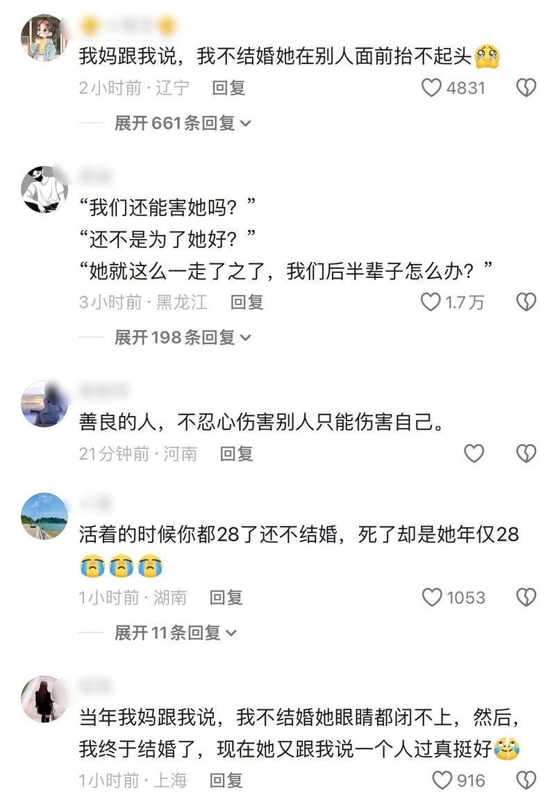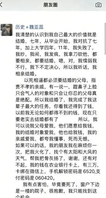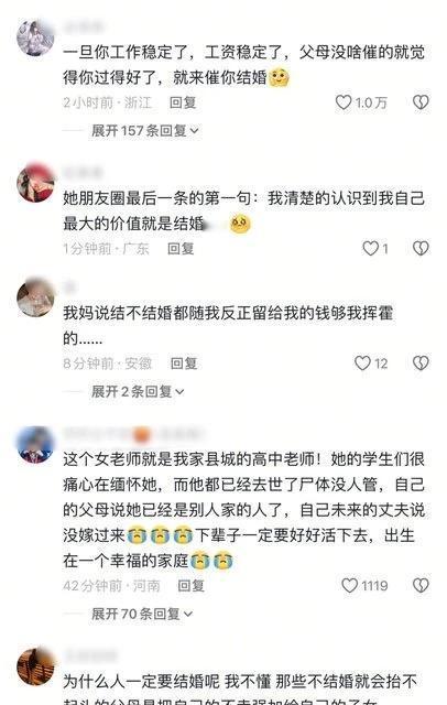 28岁高中女教师新婚之夜跳楼身亡,死前朋友圈最后一条第一句就是:“我清楚地认识到我自己最大的价值就是结婚……” 被迫相亲、被迫结婚、被迫做听话的乖女孩就是逼死她的根本原因,然而她的死并不会被家人和亲戚理解,他们只会反过来埋怨她思想观念走极端…… 当代女性婚姻观 所以结婚的意义到底是什么 希望每个女孩都能被善待