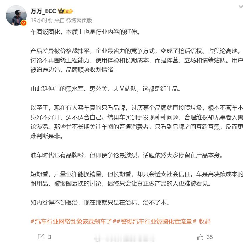 车圈饭圈化和行业内卷没关系。饭圈化是一种粉丝经济手段,跟有没有内卷没关系,苹果什么时候内卷了?没有吧,一样有饭圈化。很多车企内卷成那样也没饭圈为啥呢?因为这俩根本就没关系。饭圈会是有前提条件的,你看娱乐圈那些,比如肖战、王一博,他们得有爆品影视剧,有偶像经营,有粉头,有价值认同,还得是对家(有外人才能团结)。放到其它圈子也是如此,如果这些都没有,你再怎么卷也不会有饭圈,如果有这些卷不卷都有饭圈。这个饭圈化只要影响力到了就会有,有些企业可能也会去经验粉丝,只要有就是粉丝群体就会有极端的,只是有些极端比例高有些不高。