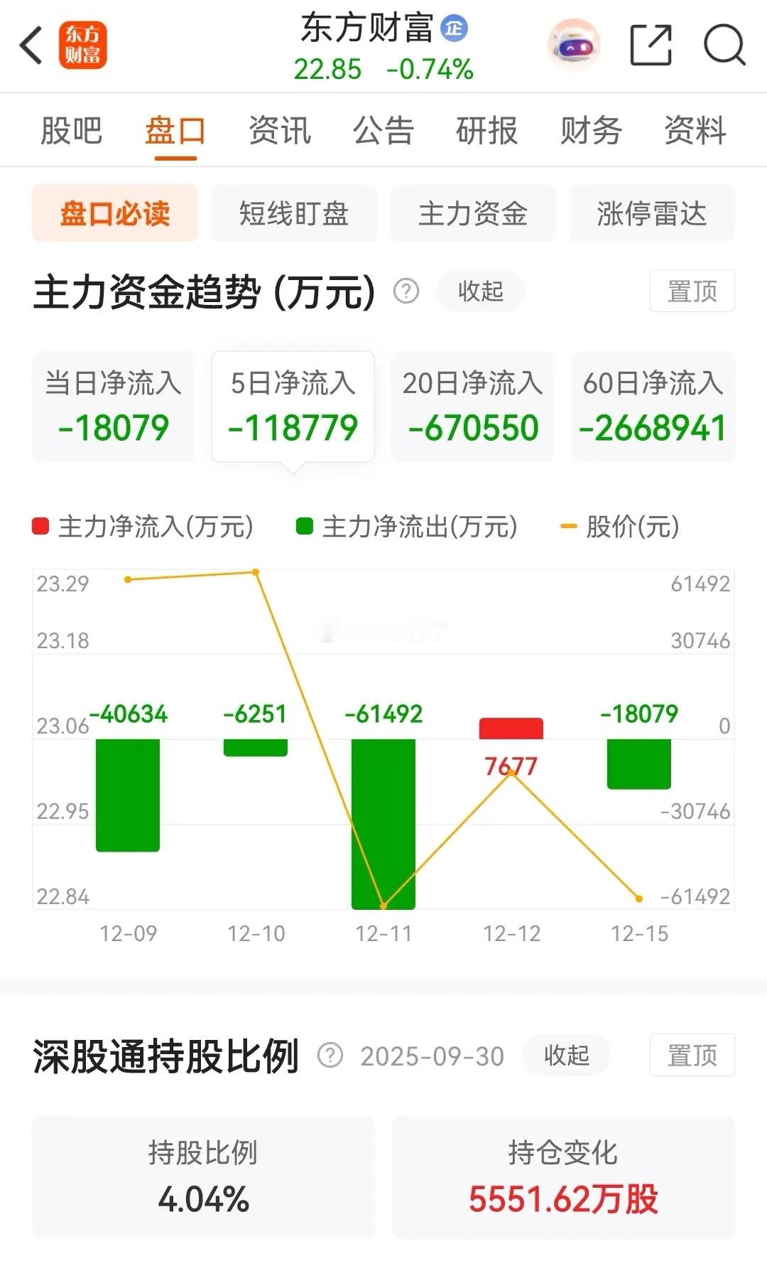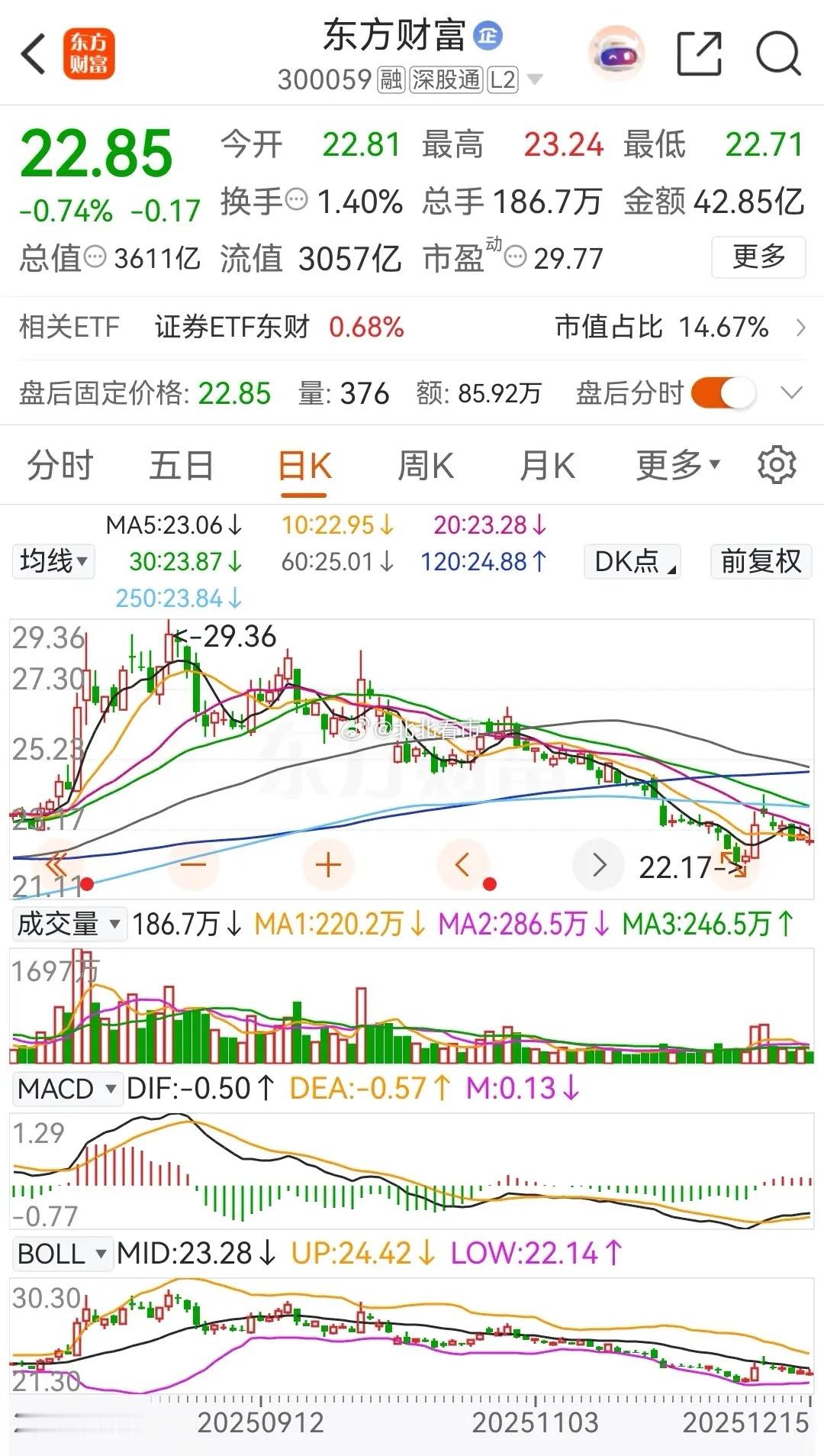 东方财富今天冲高回落,收出了一颗缩量十字星线,下跌了-0.74%,且被主力资金净