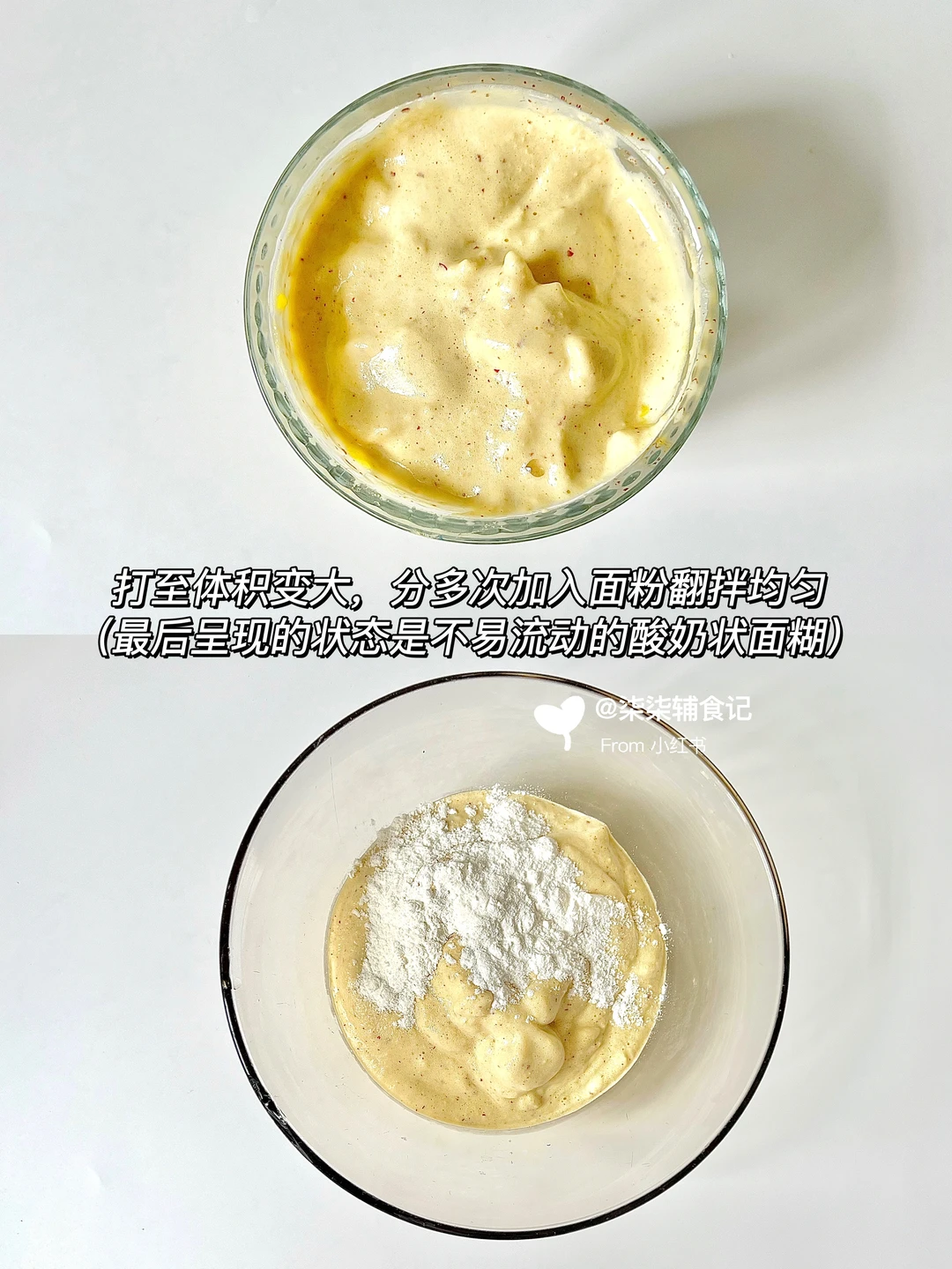 ▫️面粉分多次加入糊糊中,有的面粉吸水性好,面粉克数上下增减5g左右,面粉翻拌均匀后是不易流动的酸奶状面糊