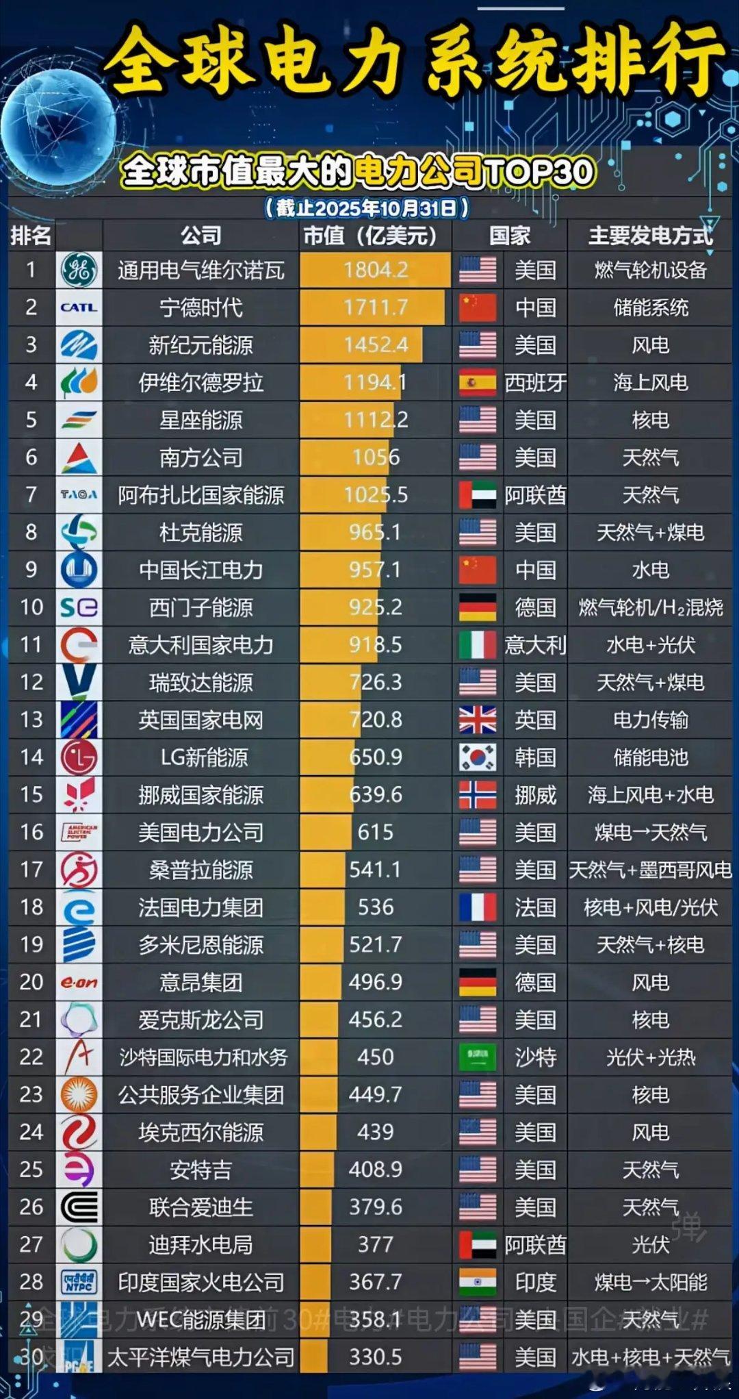 全球电力公司市值榜洗牌,中国企业凭什么跻身第一梯队?当宁德时代以1711.7亿美元市值位列全球电力公司第二,长江电力跻身第九,2025年全球电力企业市值TOP30榜单的格局变化,不仅折射出能源转型的全球趋势,更凸显中国电力企业在储能、水电领域的技术与规模优势,在传统能源向新能源的转型浪潮中,中国企业正以差异化的赛道布局抢占全球电力产业的核心话语权。新能源与储能赛道的突破成为中国企业市值跃升的核心动力,宁德时代的储能系统技术全球领先,液冷储能柜的能量密度提升至280Wh/L,适配电网侧、用户侧等多场景储能需求,2025年储能业务营收突破千亿元,占总营收比重达40%,成为全球储能产业的绝对龙头;其钠离子电池技术实现量产,在低速电动车、户用储能场景的商业化落地,进一步打开成长空间,市值仅次于通用电气维尔诺瓦,印证了储能在电力系统中的核心价值。传统电力企业则依托资源优势筑牢基本盘,长江电力掌控长江流域优质水电资源,旗下三峡、葛洲坝等电站的年发电量超2200亿千瓦时,水电业务的毛利率稳定在60%以上,现金流充沛且分红率持续超70%,成为价值投资的标杆;在新能源转型上,长江电力的光伏、风电装机量突破1000万千瓦,“水电+新能源”的模式让其在能源转型中保持业绩稳健,957.1亿美元的市值彰显了传统电力企业的转型韧性。全球电力企业的市值排名,本质是能源结构转型的直接映射。美国企业凭借天然气、风电、核电的多元布局占据榜单主流,通用电气维尔诺瓦的燃气轮机设备市占率超30%,新纪元能源的风电装机量居全球首位;欧洲企业则聚焦海上风电与氢能,伊维尔德罗拉的海上风电装机突破2000万千瓦,西门子能源的氢能燃烧技术实现燃气轮机低碳改造;中国企业则在储能、水电领域形成独特优势,宁德时代的储能技术、长江电力的水电资源,成为全球能源转型中不可忽视的中国力量。2025年全球新能源发电占比提升至38%,电力企业的市值竞争已从传统发电规模转向技术创新与赛道布局。当宁德时代的储能系统、长江电力的水电资源形成协同,中国电力企业不仅在全球市值榜单中跻身第一梯队,更在能源转型的关键赛道中掌握了技术与市场的双重主动权,为全球电力产业的低碳转型提供了中国方案。