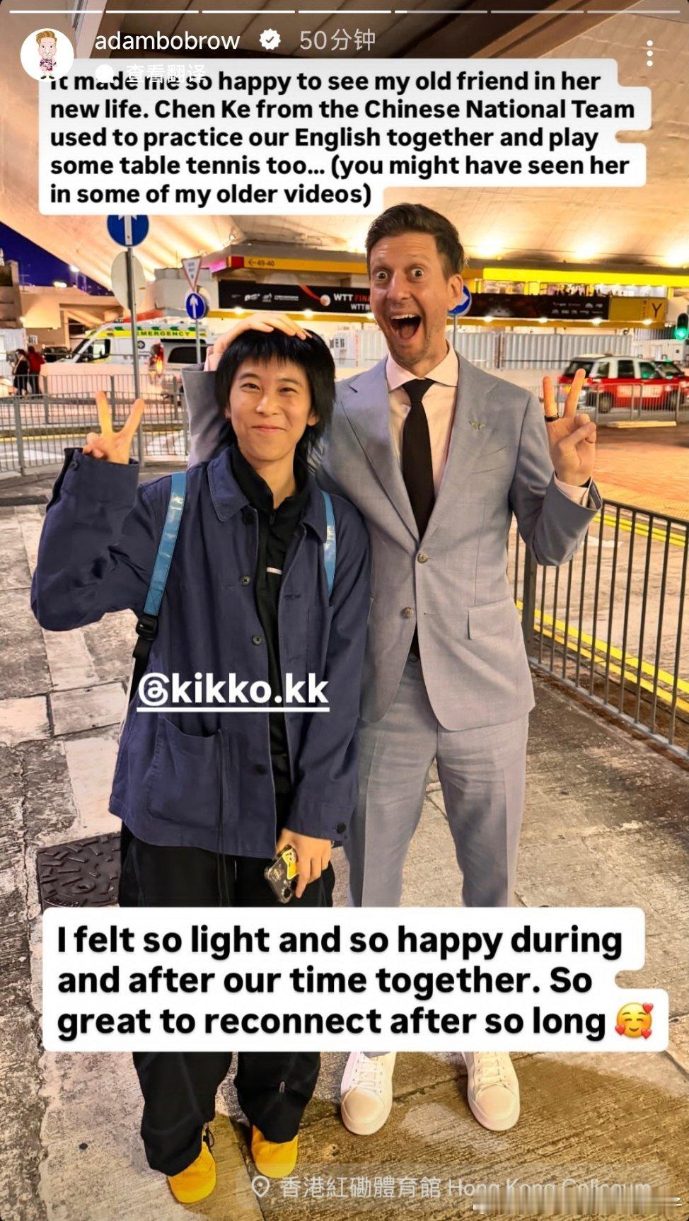 Adam分享了和陈可的合影:看到老朋友开启新生活,我真的特别开心。中国国家队的陈可以前会和我一起练英语,偶尔也会打打乒乓球……(你们可能在我之前的一些视频里见过她)和她相处的时光里以及之后,我都觉得特别轻松、特别开心。时隔这么久能重新联系上,真的太好了🥰