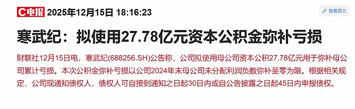 盘后,A股市场四大重磅消息!寒王一则公告引起市场高度热议,该怎么解读?明天的A股重点看什么?一文说明白:1、刚刚,寒王发布公告,使用母公司资本公积27.78亿元用于弥补母公司累计亏损,该怎么解读?很多股民朋友看到这一消息的第一反应就是负面情绪,有说是违法行为的,也有说是拿募集的钱弥补亏损的,也有说经营不好亏损的等等;因为很多人上周末刚看好摩尔拿闲置募集资金75亿去现金管理的消息,今天又看到寒王的公告,所以内心不能接受。其实,大家需要冷静的看待,因为这个和摩尔完全不是一回事,也没有很多人想象的那样。上市公司拿资本公积金弥补亏损这是2024年7月份新出台的公司法中允许的行为,也就是说是合法合规的,需要经过股东大会决议;这算不上是利空消息,算是一个积极的消息,因为这相当于是优化财务报表的一种行为,公司今年前三季度实际上已经是有盈利的,现在用资本公积金弥补2024年亏损,也是为了后续可以分红,送股等回报投资者的操作扫清障碍;因为未分配利润为负数的时候,一般是不能正常分红的,这样大家就应该可以理解为啥要弥补2024年亏损了。总的来说,大家可以理解为这是优化财务资产负债表的一种方式,优化过后就是累计亏损变成了未分配利润为0,后续分红和回报投资者就是正常了,严格来讲是偏利好的消息。关于财务方面的内容,我觉得大家有时候也可以去补补课,不一定非得被带节奏。2、沐曦股份将于12月17日科创板上市,这个消息怎么看?12月5日摩尔上市,上市之后股价一度涨到900以上,上市之前公司估值200多亿,上市之后市值翻20多倍,这只需要一年的时间;而周三沐曦股份也要上市了,会重演奇迹吗?对于中签的资金来讲,参考摩尔上市,会享受到估值溢价的,但是不一定会重演摩尔的大涨;公司也提示了在新股上市初期切忌盲目跟风“炒新”,应当审慎决策、理性投资,另外上周五刚刚经历了摩尔把募集闲置资金进行现金管理的消息,市场还存在一定的负面情绪,可能跟风炒作不会太疯狂;总的来说,上市之后估值大幅提升是确定性的,但是炒作可能不会太过于疯狂,对于没有中签想要后面跟风炒新的资金来讲,确实需要保持理性。3、磷酸铁锂行业迎来利好消息,有头部行业提前锁单扩产,行业集体提价潮开始;磷酸铁锂正极材料厂商集体提价,新能源产业链反内卷终于有了效果,反内卷作为经济工作会议中的重要方向之一,现在也是看到了效果;这对于新能源产业链来讲算是利好消息了,锂矿,光伏,风电,储能等上中下游整个新能源产业链,只要有一环出现提价,那么环环相扣都会有提价的预期,而提价就是对产业股价最有利的刺激;反内卷虽然有提前炒作的预期,也都涨了一些幅度,但回落下来还有机会,因为从业绩的角度来讲,提价预期下,四季度以及明年的业绩可能会有改善的预期;4、今晚,工信部发文许可两款L3级自动驾驶车型产品,其被看作是L3迈入商业化进程的关键一步。L3定义是有条件自动驾驶,L3之前,属于系统辅助人驾驶,驾驶员是全程负责的,但是L3之后,法规明确是“系统和车企”将会承担主要责任的,所以权责上有明确之分;而且也标志着无人驾驶进入新纪元,相关产业链概念是利好,主要是这些方面:一是两款车型分别来自于长安深蓝和北汽极狐;二是对于激光雷达,智能底盘等汽车零部件是利好;三是对于高算力芯片,汽车芯片,高精度地图等也是直接的利好;所以明天无人驾驶概念,汽车核心零部件相关概念股会迎来资金的炒作参与。5、最后,说一下对于明天指数还有方向的看法;大盘指数明天保持窄幅震荡概率较大,3850点是支撑;创业板指数承压,主要是看CPO光模块是否止跌;板块来讲,美股AI科技交易泡沫担忧冲击A股市场科技,短期消费扩内需迎来利好,所以短期消费内需会强于科技;另外,今晚无人驾驶的利好消息,会成为明天市场短线资金炒作的热门题材概念为主;A股市场今天缩量较为明显,也代表短期下跌空间有限,跟风资金越是不敢进场,市场跌幅越有限,一旦跟风资金追涨入场,那么冲高就会有资金兑现;所以,今天跌破1.8万亿之后,若市场再度缩量,反倒也不用恐慌,只是年底行情本身就是煎熬,需要把握时机节奏,控制好仓位才行。