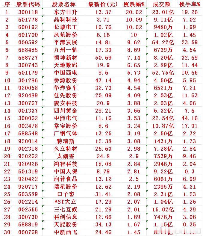 12月15日,MACD日线金叉的30名单汇总东方日升:最新价13.37元,大涨20.02%,20%涨停。晶科科技:最新价3.71元,上涨10.09%,10%涨停)。长城电工:最新价10.76元,涨幅10.02%,实现涨停。风范股份:最新价6.16元,涨幅10.00%,封于涨停板。平潭发展:最新价14.81元,上涨9.62%,接近涨停。九州一轨:最新价17.39元,涨幅8.69%,表现强势。