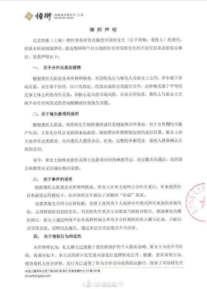 【刘昱晗回应拖欠薪资】近日,演员刘昱晗@ -刘昱晗- 因前员工指控其长期拖欠工资、断缴社保且拒绝报销工作费用,陷入劳务纠纷与职业伦理争议。12月15日,刘昱晗发律师声明,称正告崔女士,立即停止一切侵害刘昱晗先生合法权益的行为,删除所发布的涉及刘昱晗先生隐私及不实信息的内容;以公开方式,澄清事实,消除影响,并向刘昱晗先生赔礼道歉。并呼吁,请勿传播,扩散上述不实及侵权信息。对于有关侵权行为,本所已根据委托人要求完成全部证据固定工作,并将视事态发展,采取包括但不限于提起民事诉讼,向公安机关报案在内的一切法律手段,追究侵权者的法律责任,维护委托人的合法权益。