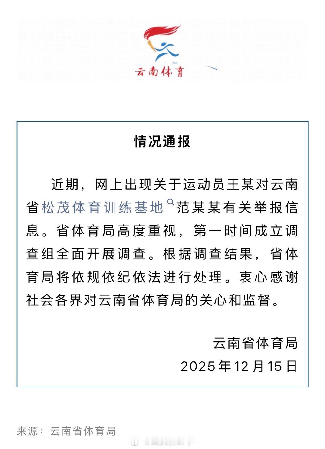 官方通报亚运会三金得主被领导索要奖金 云南已成立调查组调查王莉举报事件近日,中国皮划艇、龙舟运动员王莉实名举报云南省松茂体育训练基地负责人范某文,引发关注。举报视频中,王莉说,自己获得亚运三金,回到云南省松茂体育训练基地后,训练基地负责人范某文向她索要国家发放的15万元比赛奖金。12月15日下午,云南省体育局发布最新通报:、近期,网上出现关于运动员王某对云南省松茂体育训练基地“范某某有关举报信息。省体育局高度重视,第一时间成立调查组全面开展调查。根据调查结果,省体育局将依规依纪依法进行处理。衷心感谢社会各界对云南省体育局的关心和监督。亚运会三金得主举报被领导索要奖金