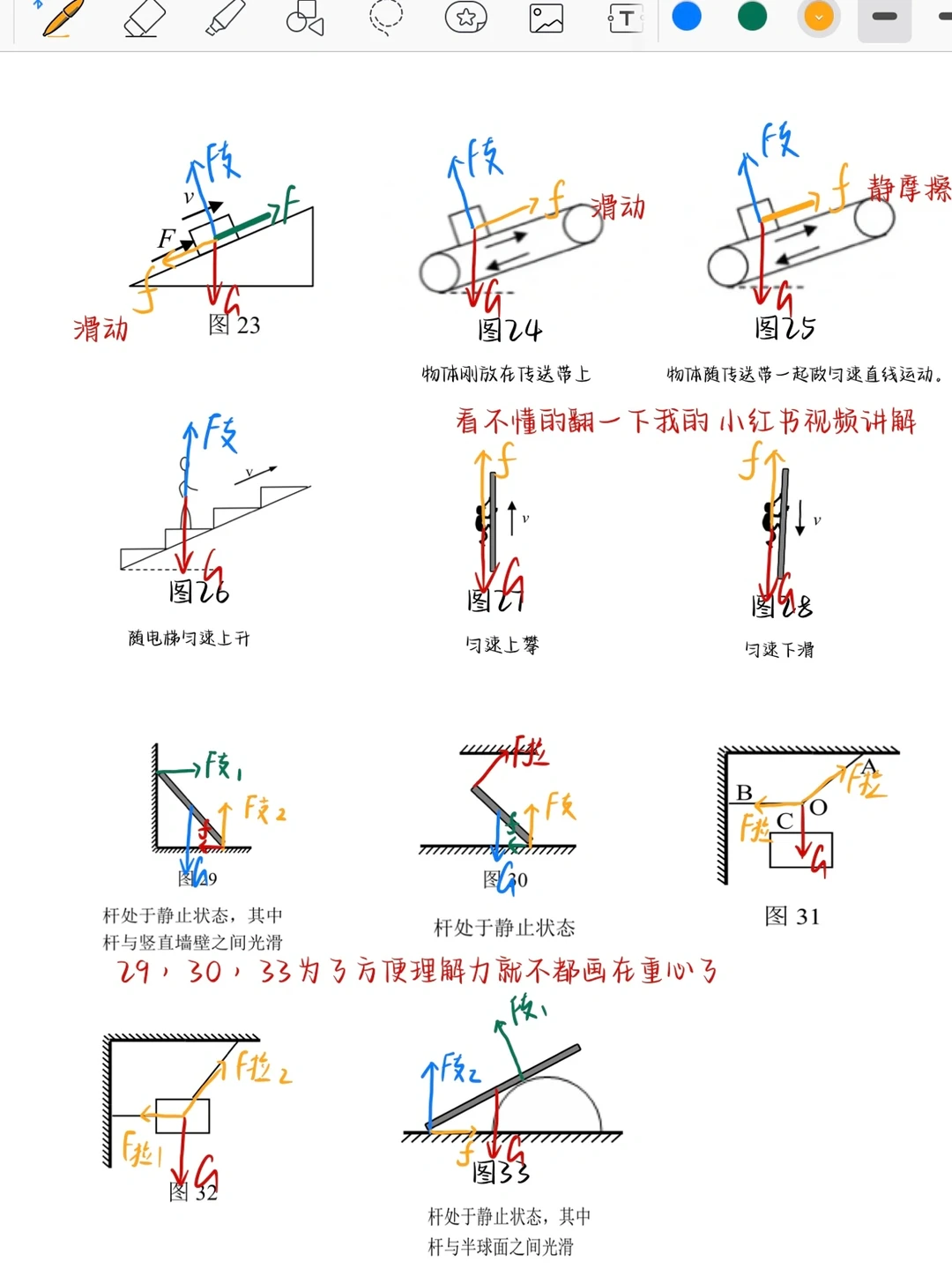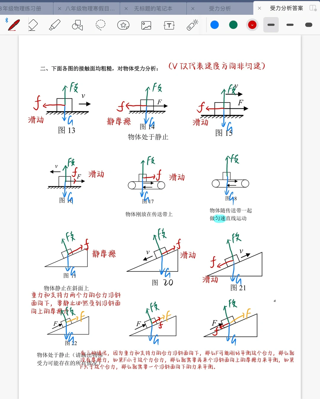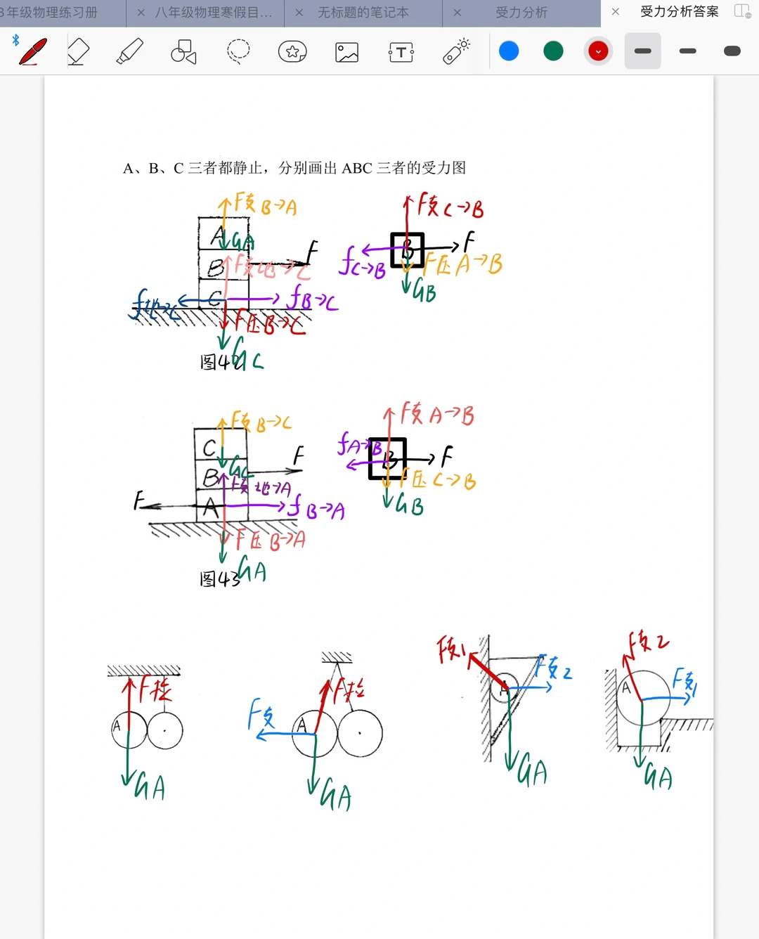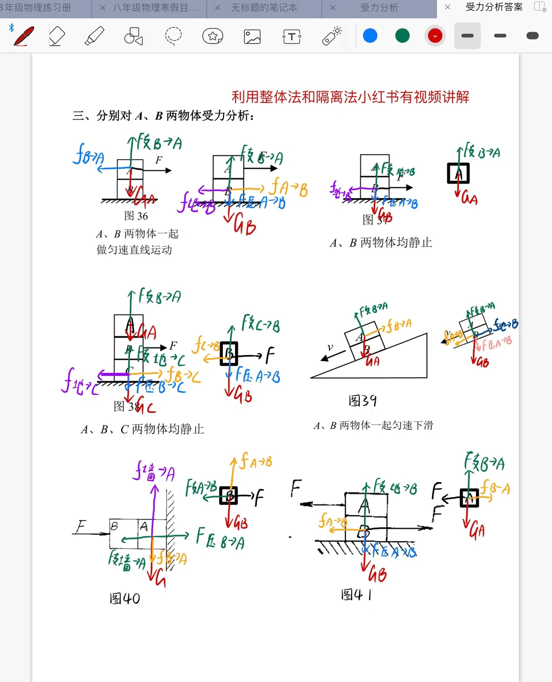 受力分析方法:选定受力对象,先画已知力,再画重力,然后再画于受力物体接触的面产生的弹力,然后判断是否有摩擦。 初中阶段也需要对整体法和隔离法有一定的了解。