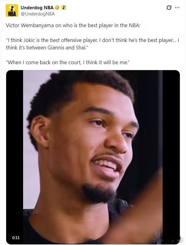 文班亚马:我不认为约基奇在攻防两端的表现都是最棒的日前,美媒《Underdog NBA》报道了一段文班亚马的采访,在被问到谁是他心目中的NBA最佳球员时,文班表示:“我认为约基奇是最佳进攻球员,但我不认为他是最佳球员……如果把选择维度扩大到攻防两端,我觉得应该在扬尼斯和亚历山大之间选择。”在采访中,这位联盟的未来之星还颇为自信的表示:“等我重返赛场时,最佳球员会是我!”
