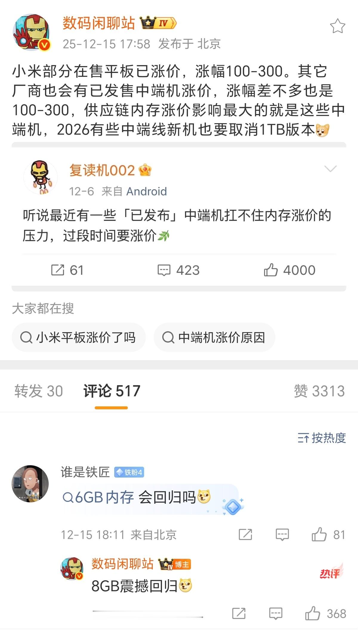 白fans已确认,明年中端产品大面回退至 8GB 内存起跳,且为保留基础内存成本处理器外围均会动刀,部分厂商会重现 6GB 产品(6+256 甚至 8+512,刺不刺激)。站在现在这个时间点,年中与上半年发布的高性价比产品降价后『会是从今天开始近两年最划算的高性价比机器』,且买且珍惜
