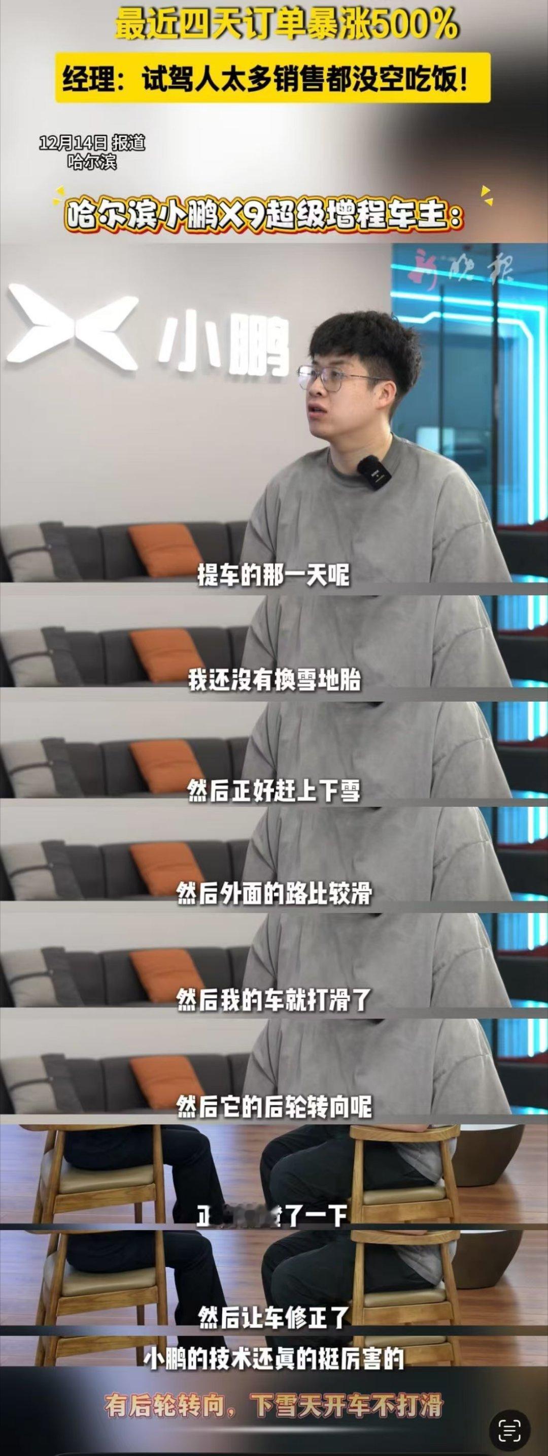 小鹏X9超级增程试驾火爆销售没空吃饭小鹏X9超级增程在哈尔滨卖爆了!哈尔滨一门店订单量在4天内增长超500%,试驾火爆到门店销售午饭都顾不上吃。并且,用户购买决策非常果断,50%用户试驾完在现场即完成下定。50%用户试驾完小鹏X9超级增程当场下定已提车车主表示,1602km综合续航足够长,非常适合全家人出行;超450公里的纯电续航,足够日常市区通勤需求,下雪天有了后轮转向也不怕打滑。小鹏X9超级增程在北方市场的订单占比已超过50%,超长续航、冰雪稳行系统、后轮转向等精准应对了北方用户在冬季出行中对续航、安全与操控的需求。