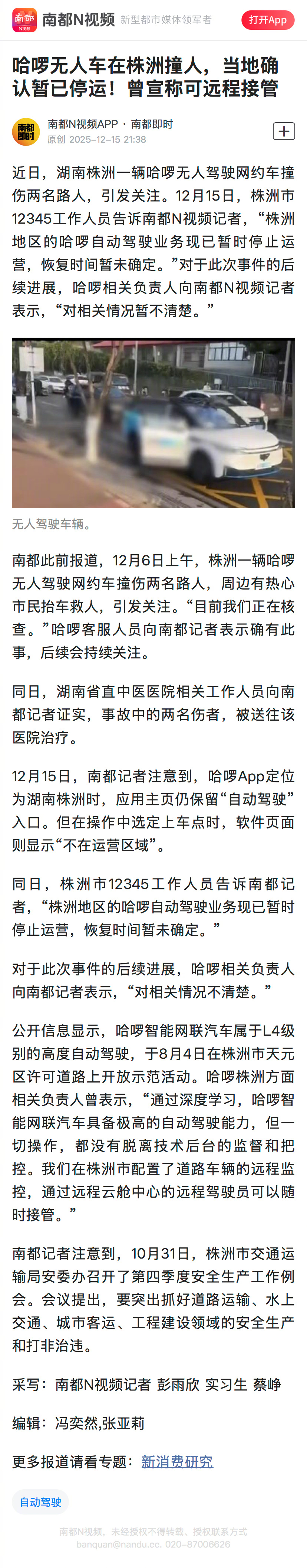 #哈啰无人车株洲撞人后暂停当地业务#【哈啰无人车在株洲撞人,当地确认暂已停运!曾宣称可远程接管】近日,湖南株洲一辆哈啰无人驾驶网约车撞伤两名路人,引发关注。12月15日,株洲市12345工作人员告诉南都N视频记者,“株洲地区的哈啰自动驾驶业务现已暂时停止运营,恢复时间暂未确定。”对于此次事件的后续进展,哈啰相关负责人向南都N视频记者表示,“对相关情况暂不清楚。”南都N视频记者 彭雨欣 实习生 蔡峥