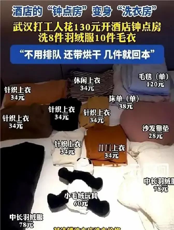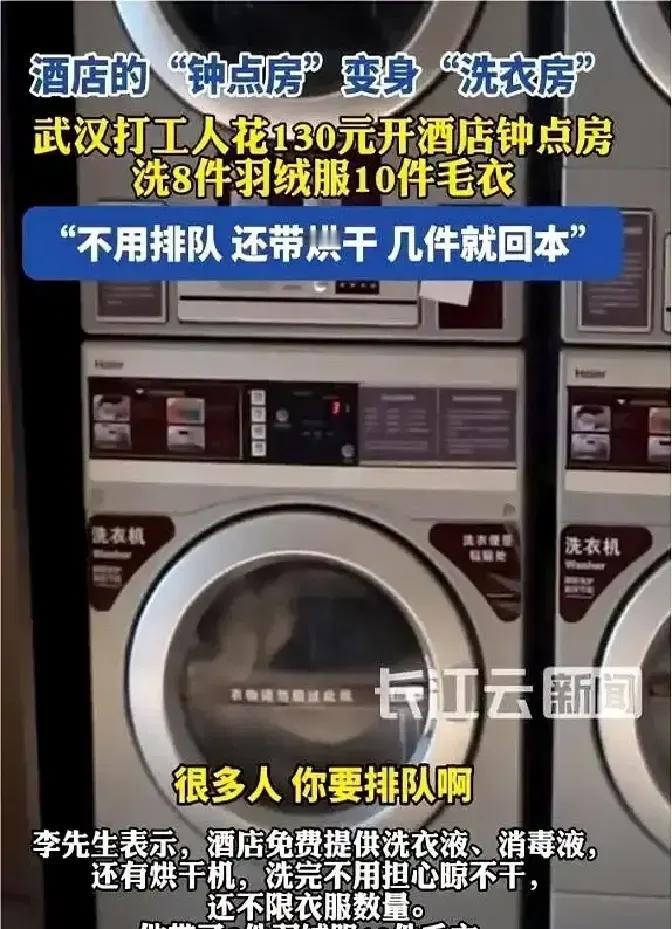 年轻人花130块开钟点房,把羽绒服毛毯全扔进酒店洗衣机,两小时洗烘完事,比干洗店便宜一半。 消息一甩上网,点赞飙到五十万,评论区全是“明天组团”有人拎零食带音箱,把客房开成洗衣趴,前台小姐姐还贴心送篮子和消毒液,业绩直接涨。 干洗店老板刷到视频一脸懵:我收八十,他们人均三十,还顺带吹空调拍大片,这生意怎么做。 我租房那破阳台晾三天还滴水,烘干机轰隆隆一响,毛毯蓬松得跟新买似的,谁不心动。 酒店也精,悄悄推“生活服务房”,默认你进来就是洗衣服,先占坑再说。 省钱不丢人,把酒店当自助洗衣房,是年轻人给高房租交的反向答卷。