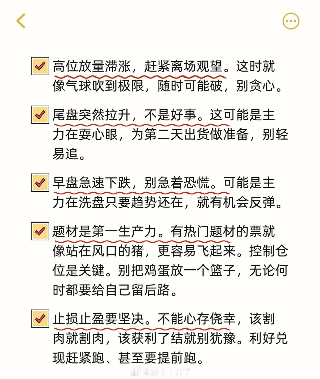 围绕股票投资实操策略展开,分别总结了“散户养家的基础铁律”与“关键操作建议”,核心要点如下:一、散户养家的4条核心铁律聚焦“识别主力信号+把握趋势机会”,强调跟随主力、顺势而为:1. 量能辨主力:放量代表有主力参与(市场有活力),缩量则多是散户博弈(无机会);2. 趋势优先:只做上升趋势(顺水行舟易盈利),绝不碰下跌趋势(逆水难挣钱);3. 均线信号:均线多头排列(多方占优,如“大军压境”)时,可大胆进场做多;4. 底部异动:底部放量涨停(如“沉睡狮子苏醒”),往往是后续大行情的信号。二、股票投资的5条关键建议针对“规避风险+强化纪律”,解决具体操作中的常见误区:1. 高位警惕:高位放量滞涨(如“气球吹至极限”),需立即离场观望,忌贪心;2. 尾盘勿追:尾盘突然拉升多为“主力耍心眼”(为次日出货铺路),不宜追高;3. 早盘不慌:早盘急跌可能是“主力洗盘”,若趋势未破,无需恐慌(有机会反弹);4. 题材与仓位:① 题材是“第一生产力”——热门题材股易“站在风口起飞”;② 控制仓位——忌满仓(别把鸡蛋放一个篮子),留后路;5. 纪律底线:止损止盈要“坚决”——不存侥幸(该割肉就割、该止盈就了结);利好兑现(甚至提前)需跑路。整体逻辑“从基础认知(辨主力、看趋势)到具体操作(避陷阱、守纪律)”的股票投资框架,核心是“跟主力、顺趋势、控风险、守纪律”,帮助散户规避盲目操作,提升决策合理性。