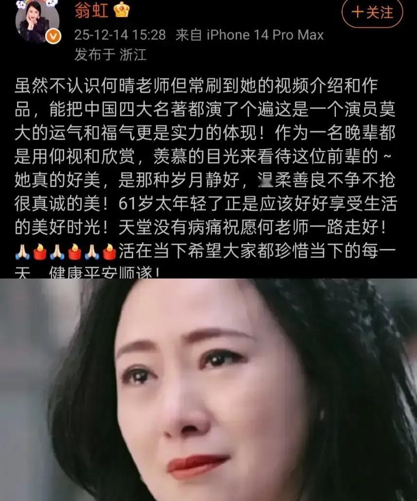 网上突然刷到“何晴走了”的短视频,黑白剧照配哀乐,看着心里一紧。 可翻半天,没一家官媒出声,家人也失联,只剩热搜在爆。 刘威、许亚军这些老搭档安静如常,金晨冒出一句“不意外”又秒删,反倒是没合作过的翁虹发图致敬,被夸体面。 我看评论区吵成两派,一边骂老同事冷血,一边劝别急着点蜡,想起去年某位老艺术家也被“被死亡”,本人后来亲自录视频报平安,尴尬得满屏删帖。 这回要是乌龙,提前哭坟的人会不会再道个歉? 要是真的,起码让家属先开口,别让流量吃人血馒头。 没确认就默哀,看似热心,实则把活人架在火上烤,安静等消息才是对当事人最大的尊重。