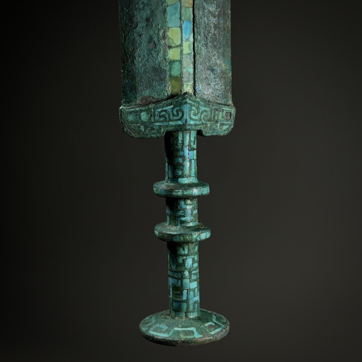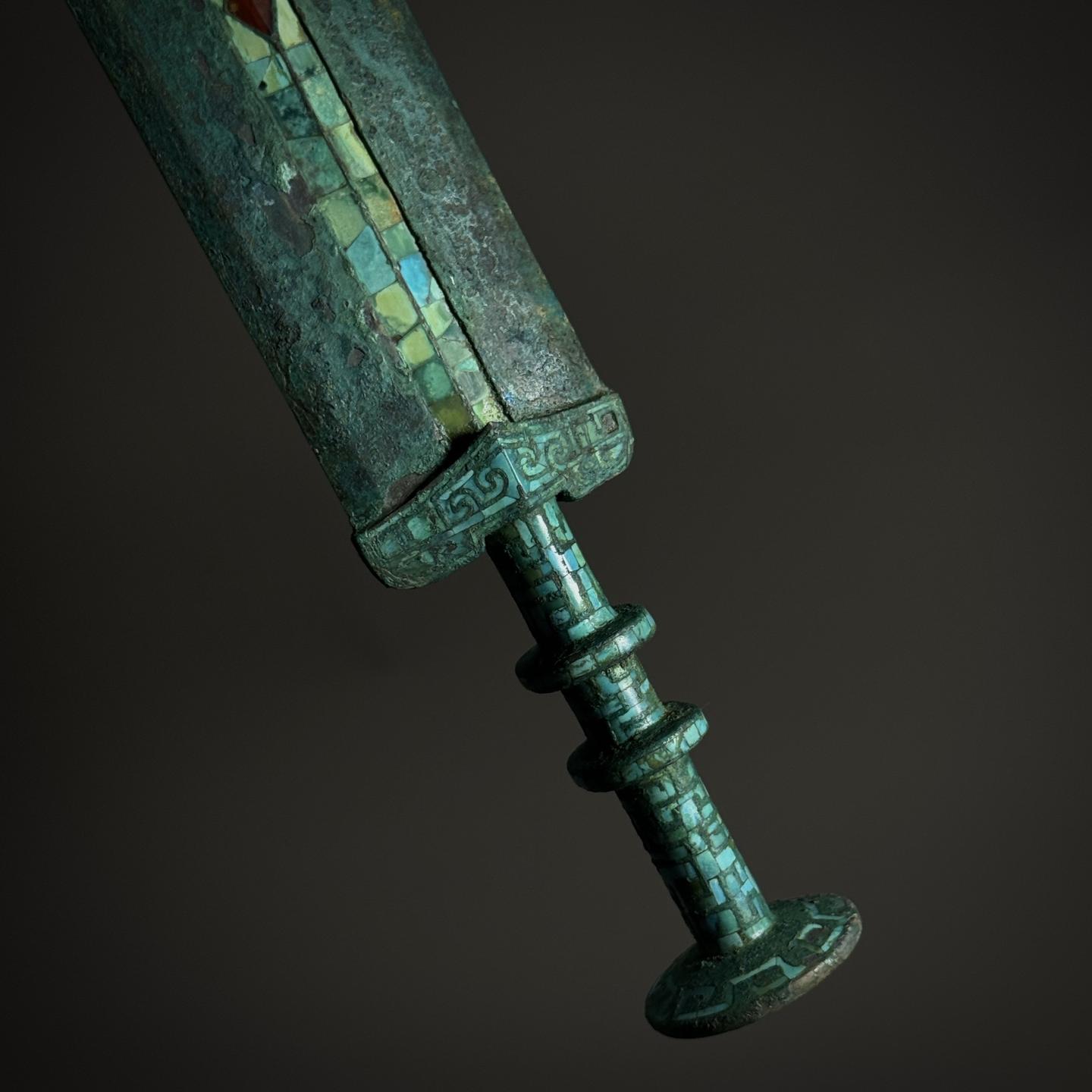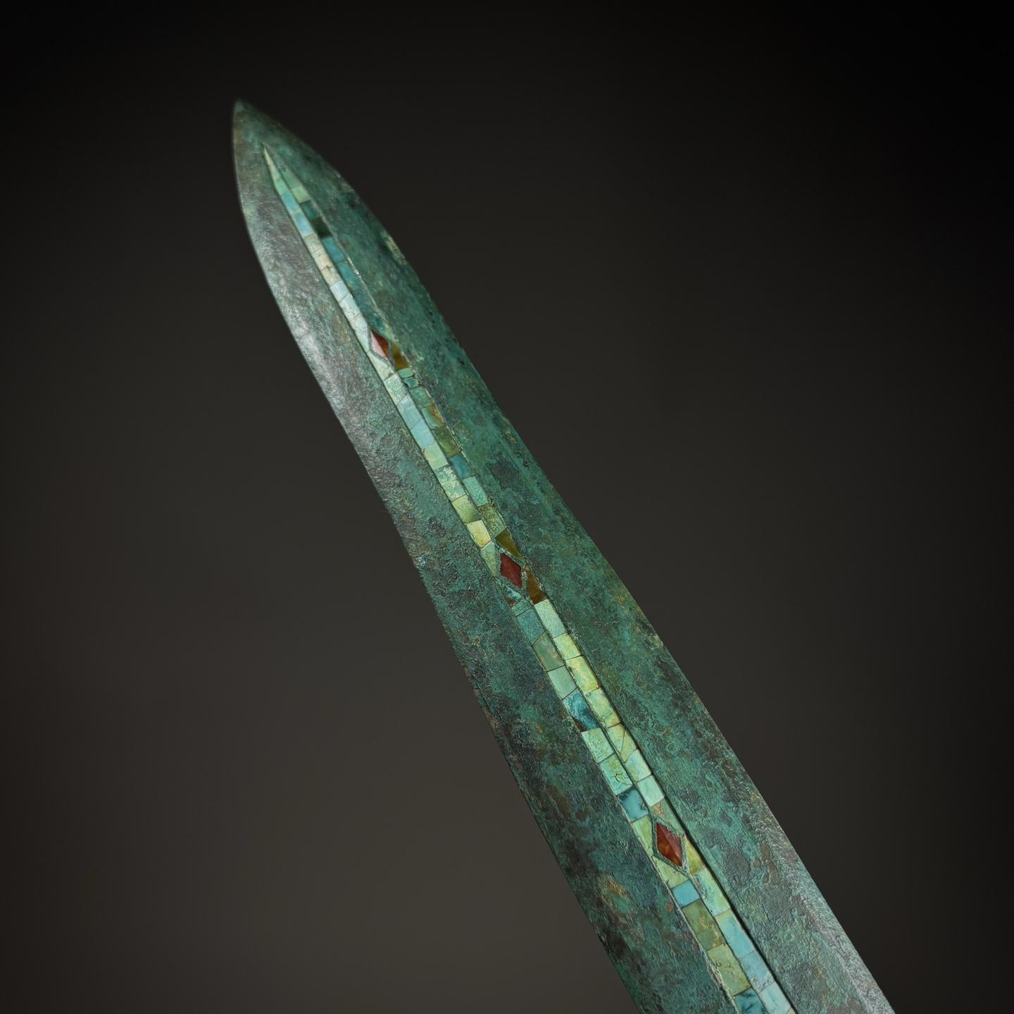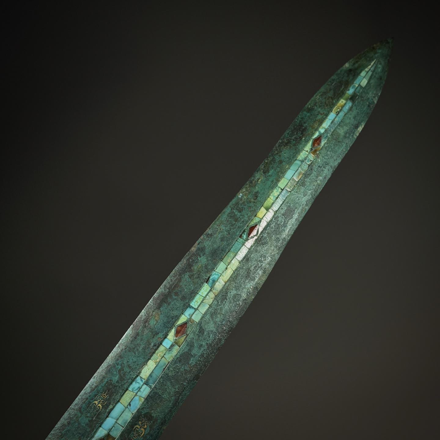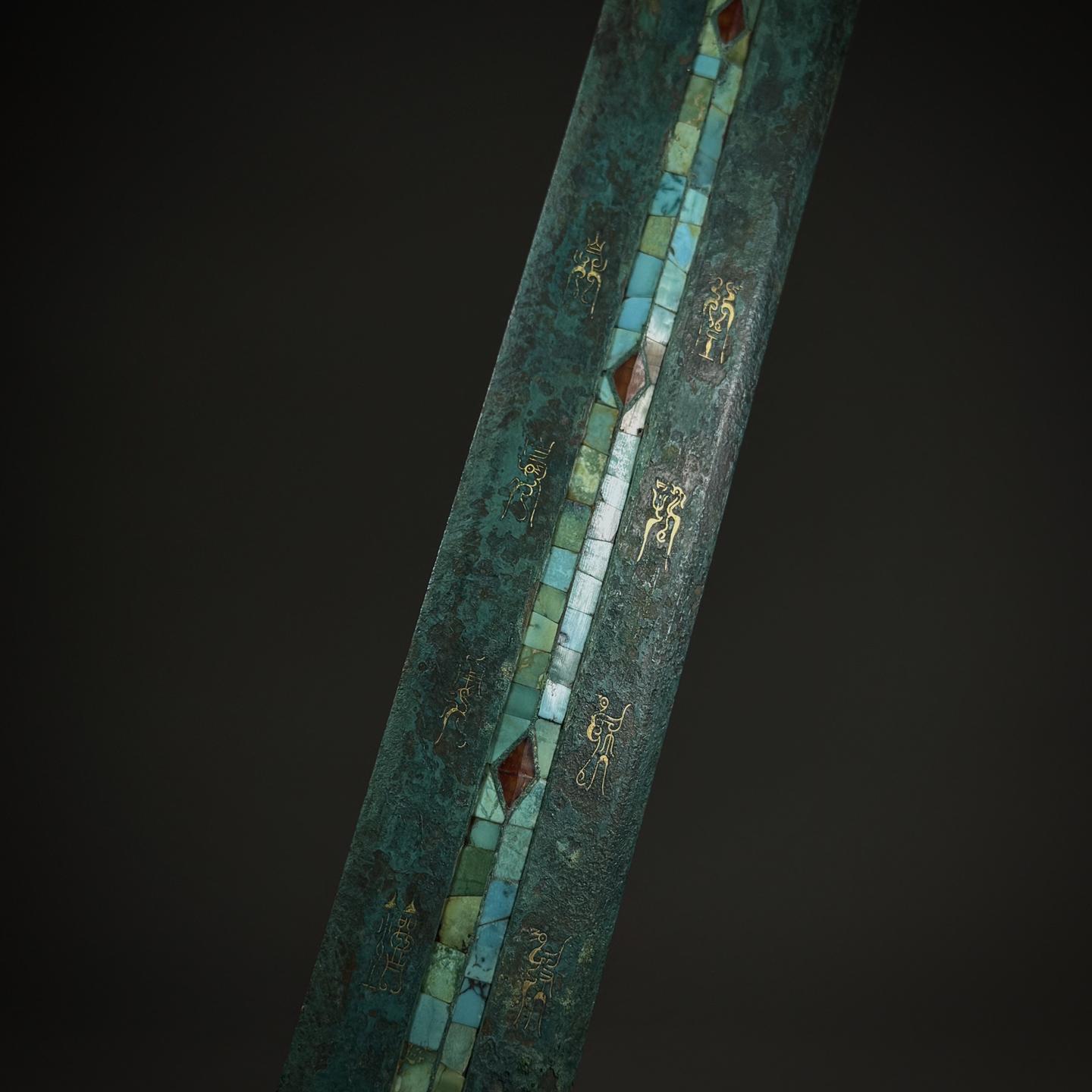 青铜剑。这柄青铜嵌绿松石剑,剑身以松石、红宝错嵌纹饰,工艺卓绝。青铜氧...