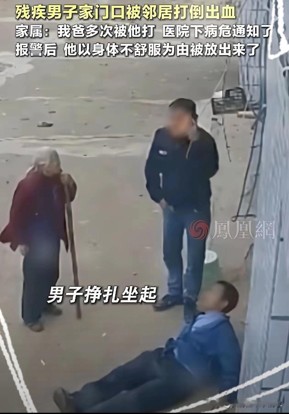 江西一残疾男子在家门口遭领居殴打,家属赶到现场后称,此男子之前就已经被对方施暴,这次情况严重,已经送往医院,医生已给伤者下了病危通知书。 家属情绪很激动,称不希望放走打人者。当地当局表示,打人者被释放符合程序,并称伤残鉴定结果已递交,目前家属坚决不和解。 打人者一行人在路过一处有群众拦住时,还曾喊出“我们又不是故意的”之类的话。在打人者打着某残疾男子时,旁边一位扶着拐杖的老人也曾提醒他们“不能打残疾人”。 打人者一行人在离开时被家属喊住,家属称“你们去医院看看吧。”视频家属称“程序正义应该保护的是受害者,而不是施暴者。”