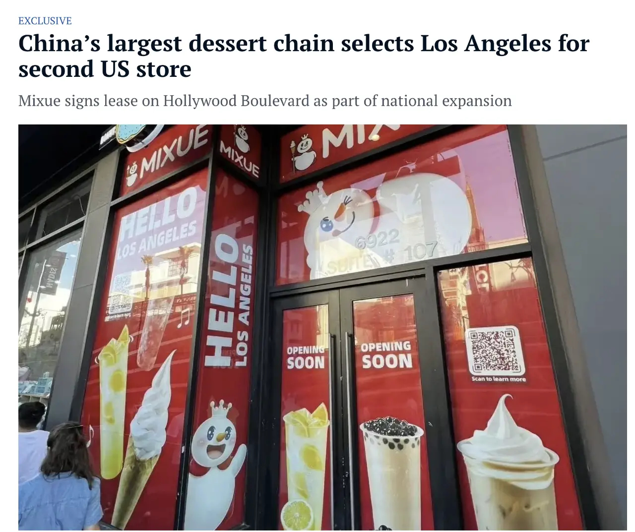#美国蜜雪冰城价格# 近期,多家茶饮品牌把战场搬到美国,蜜雪冰城位于纽约与洛杉矶的门店也正在围挡装修中。根据社交平台网友发布的信息,蜜雪冰城首店选址在纽约唐人街,第二家店定档洛杉矶。据悉,蜜雪冰城位于美国洛杉矶的门店似乎已进驻当地外卖平台。12月15日,相关外卖平台出现一家名为“MIXUE(Hollywood)”的店铺,目前已推出两款预售套餐,取餐时间定为12月19日至21日。两款套餐售价均为3.99美元(约合28元人民币),内容包含芋圆葡萄、椰果奶茶配冰淇淋,或草莓果茶、芋圆葡萄配冰淇淋组合,每单限购一份。该店铺目前未公布其他产品与价格信息。(梨视频等)