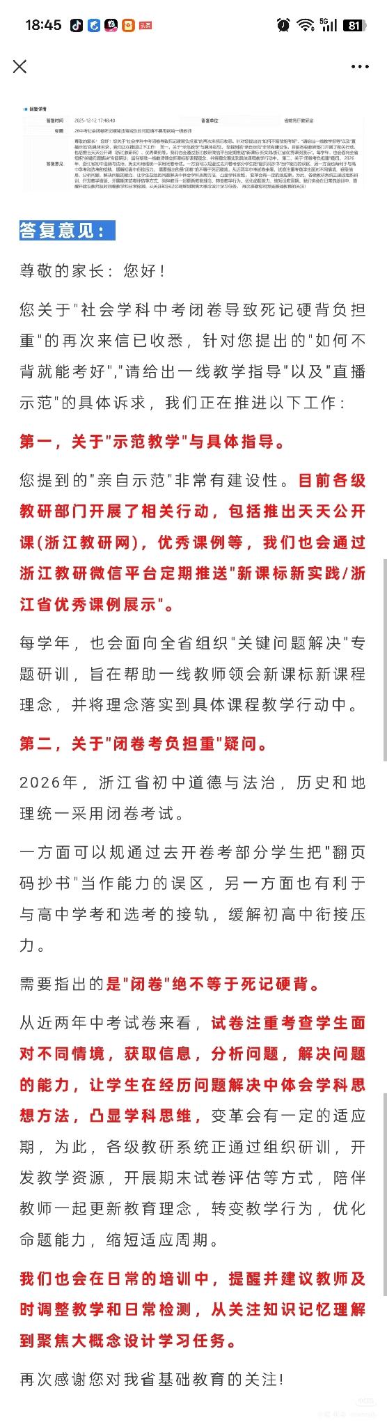 浙江家长硬刚省教育主管部门:社会中考闭卷考试导致学生负担加重,教育部门直接甩锅给一线教师。 该家长要求教育部门直播亲自示范不背怎么考好。 关于社会考试闭卷还是开卷,评论区争论还是挺大的,有不少网友认为:闭卷你知道你要答什么,开卷你都不知道它在问什么。 我觉得吧,既然如此,那开卷的同时把题目弄简单点,不就行了? 或者让学生自己选择开卷或者闭卷,然后出两套题。