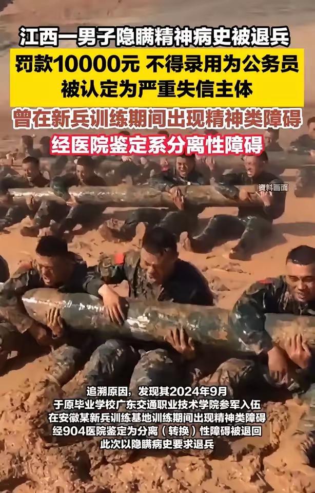 江西九江有个小伙子,前前后后报了两次兵。头一回是因为身体条件没达标被退回来的,可到了第二次,他明明知道自己之前有过退兵记录,还故意隐瞒了健康情况,硬是通过了体检和政审。结果在办军人保障卡的时候,全国征兵系统一查就露馅了——系统里清清楚楚记着他之前的退兵记录,最后不仅被罚款1万块,人也被退了回来。 其实第一次被退,按规定走的正常流程,没什么好说的。可第二次他明知道自己有问题还故意隐瞒,这性质就完全不一样了。他不光是在病史上撒谎,更是在拿征兵的严肃性开玩笑。现在全国征兵系统早就联网了,信息互通,任何记录都藏不住。像退兵、拒服兵役这些不良行为,一旦有了记录就会跟一辈子,不管是以后考学还是找工作,都会受影响。 军装对很多人来说都是特别神圣的梦想,但这份荣誉从来都只属于诚实合格的人。军队就像咱们国家的长城,征兵的门槛必须扎实,绝对不能让弄虚作假的人混进来。他这是既没把征兵制度的严格当回事,也不尊重军装的分量。人生有些污点一旦记下来,就很难再抹去了,尤其是在涉及到国家诚信的事情上,真的得老老实实才行。 大家觉得,这种故意隐瞒病史想蒙混参军的行为,到底应不应该罚得更重一点?来评论区聊聊你的想法吧! -search.byteimg.com/img/pgc-image/e16ab9e6cae643b3acdfcc7c8dda70fa~480x480.png征兵体检政审 征兵入伍政审