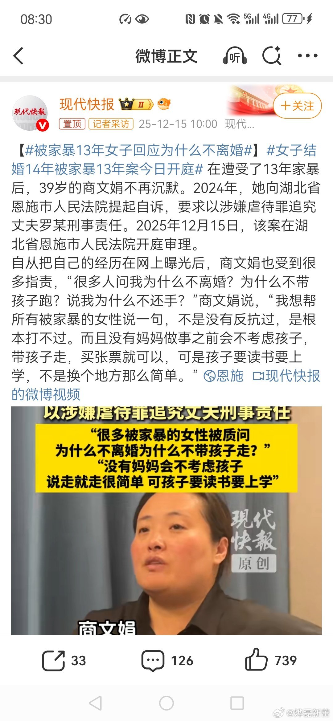 女子被家暴13年曾被打到大小便失禁【被家暴13年女子回应为什么不离婚】女子结婚14年被家暴13年案今日开庭 说到底,还是为了孩子选择了妥协,女人一旦结婚,都是为了孩子忍让,妥协,婚姻能不离婚就别离婚,但家暴的一方为什么要家暴,值得思考, 大家看过《不要与陌生人说话》吗?感觉情况比那里面只有过之而无不及。 家暴一旦严重的话,赶紧离婚,跑………