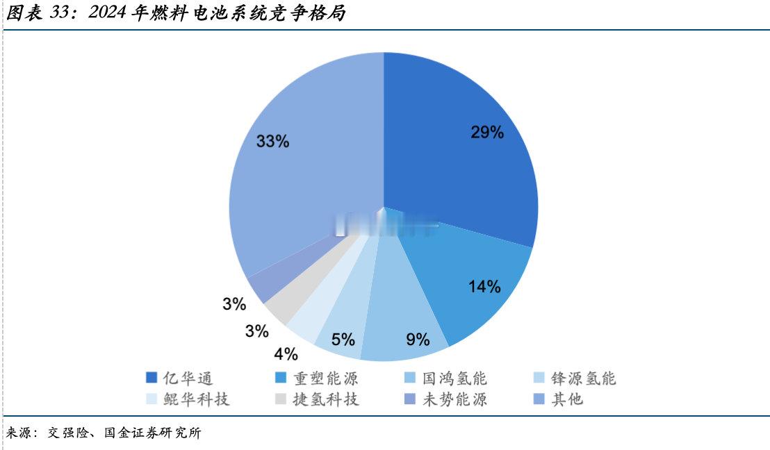 燃料电池系统头部企业市占率过半。随着行业的发展和竞争的加剧,燃料电池系统竞争格局逐步稳健,2024年从燃料电池系统供应商格局看,亿华通、重塑能源、国鸿氢能、捷氢科技、国电投为燃料电池系统前五大供应商。