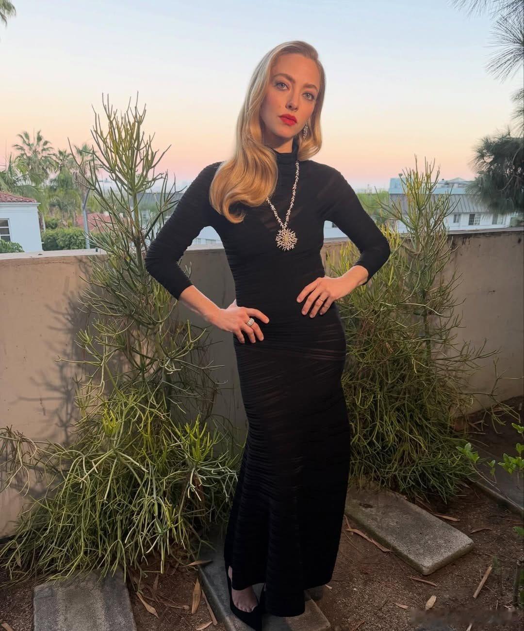 Amanda Seyfried阿曼达塞弗莱德昨日份出席《the testament of Ann Lee》洛杉矶首映礼的妆造细节,黑裙来自阿玛尼,雪花型项链则为Tiffany & Co.