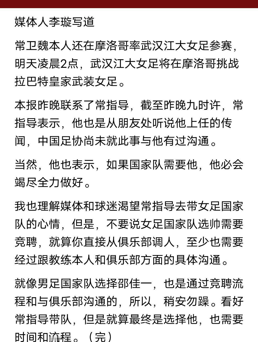 中国女足主帅现在有两个人选,但都不是足协定的。 是两家媒体定的。 《体坛周报》在北京时间15:23押注常卫魏。 三小时后,《足球报》在18:47亮出陈婉婷的名字。 两篇报道像两发炮弹,在球迷的信息流里炸开。 这不是报道,这是赛跑。 媒体在卷谁离“内部消息”更近一寸。 你看到的不是新闻,是两家机构对“定义真相权”的无声撕扯。 流量算法在背后计算每一次点击。 教练是谁已不重要。 重要的是,下一波流量浪头在哪里。 媒体在争夺定义女足故事的笔,而笔尖对准的,从来不是球场上的22个人。 当信源打架时,真相就迷路了。 这不再是一个关于谁执教的问题,而是一个关于我们如何被“告知”的样本切片。
