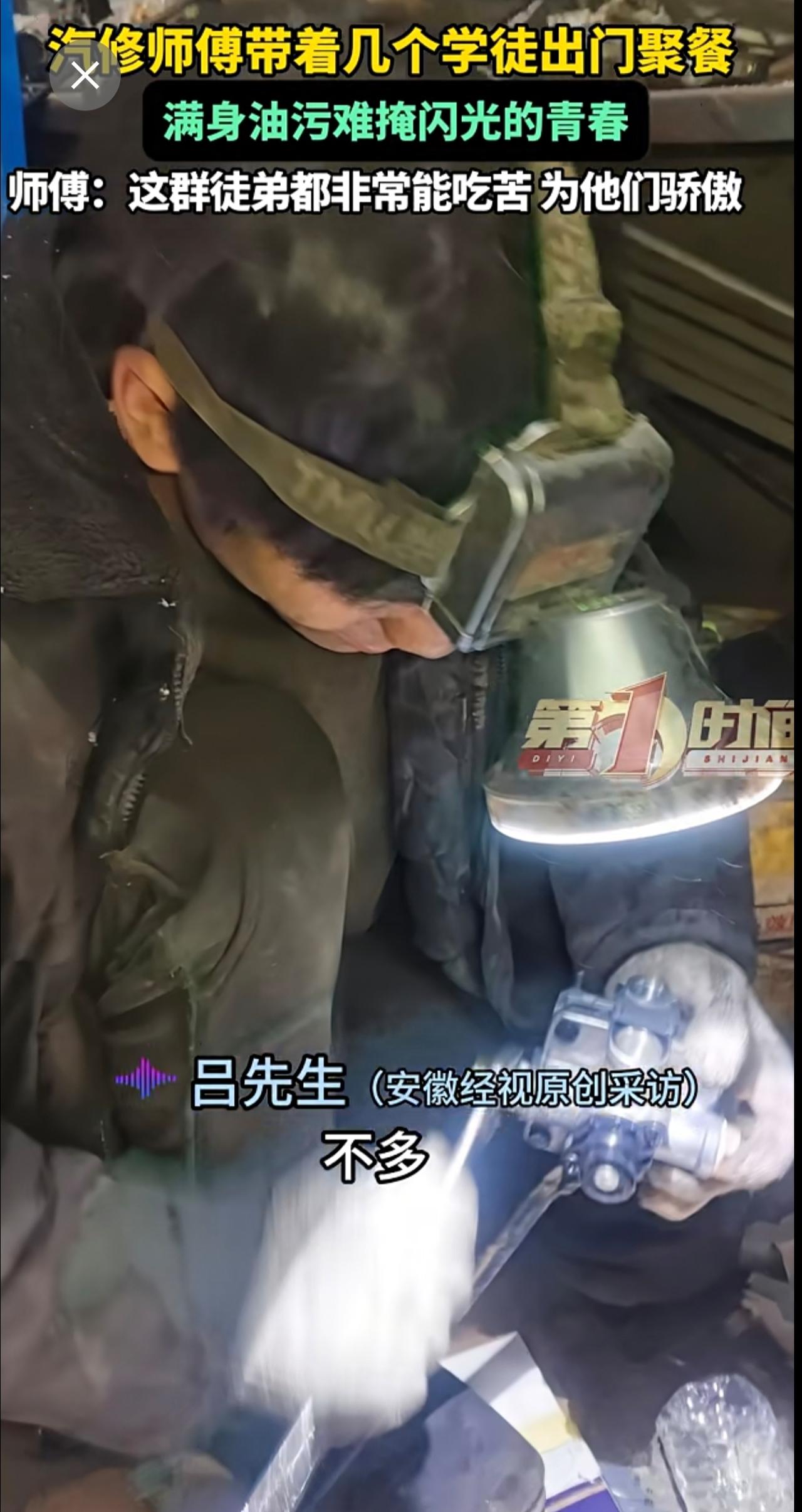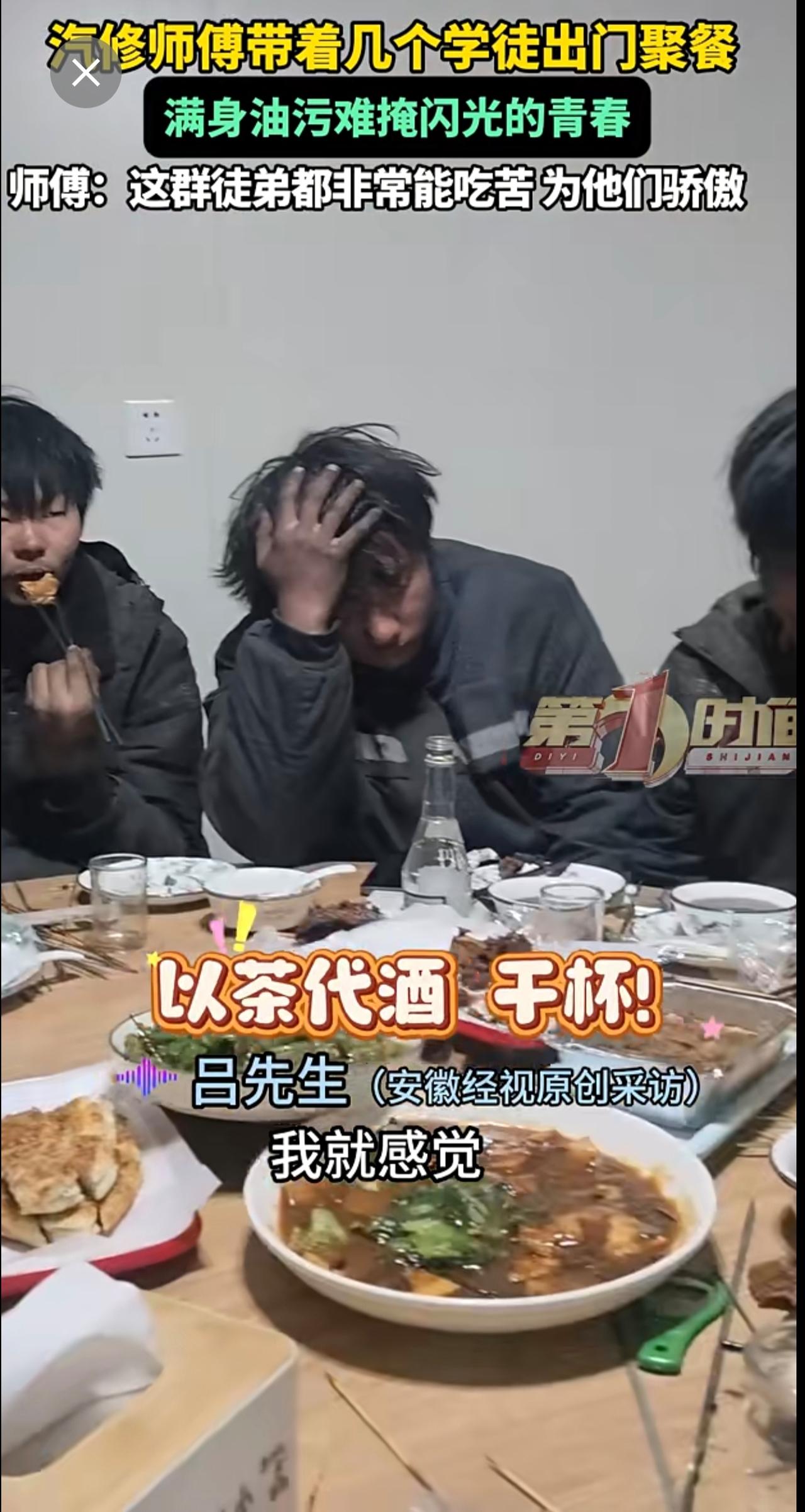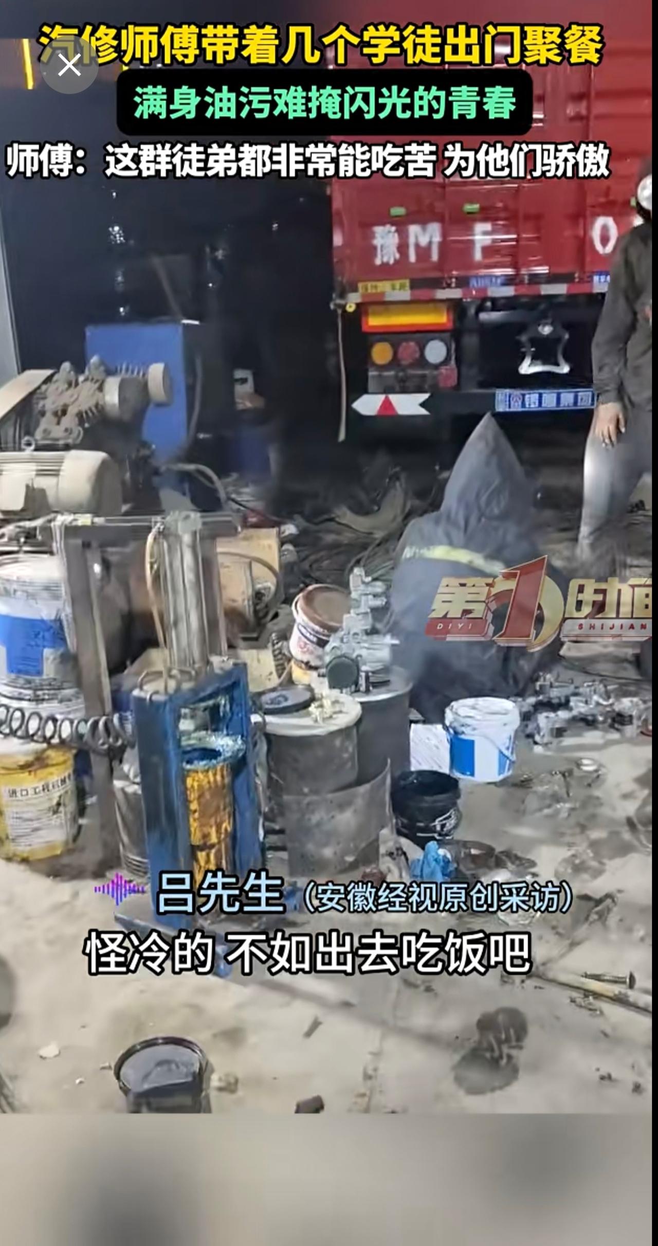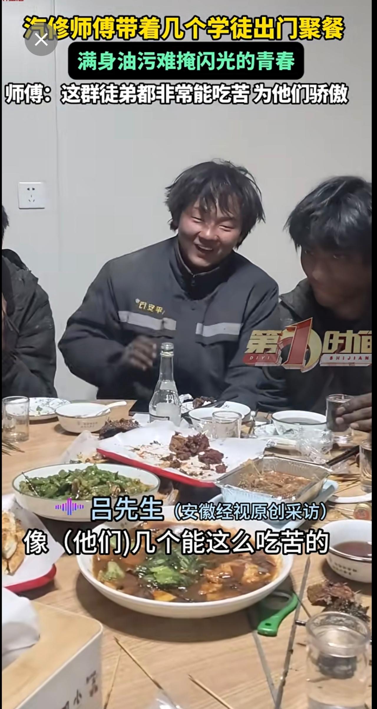 汽修师傅带着几个学徒出门聚餐,满身油污难掩闪光的青春,师傅:这群徒弟都非常能吃苦 为他们骄傲(AHTV第一时间)
