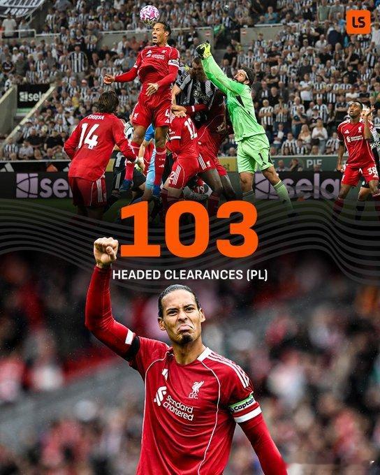 范迪克成为本赛季欧洲五大联赛首位完成100次头球解围的球员(总计103次)。比其