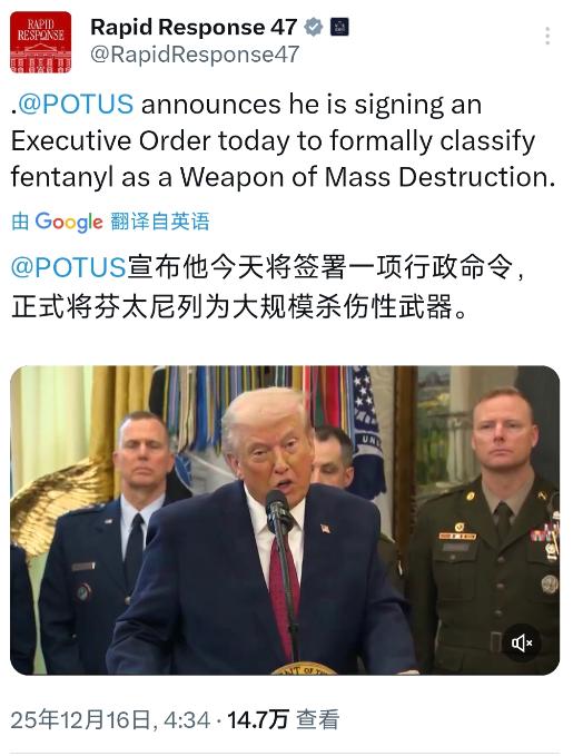 突发新闻:美国总统特朗普今天(北京时间12月16日)宣布,他将签署一项行政命令,把芬太尼列为“大规模杀伤性武器”。特朗普还表示:“没有任何炸弹能造成这样的后果。每年有 20 万到 30 万人因此死亡——而这还只是我们已知的数字!”   特朗普政府在这份即将签署的行政命令里明确指出,非法芬太尼的强效特性,让它更接近化学武器而非普通麻醉品,这一定位在全球禁毒史上都算得上是前所未有的突破。   行政命令还详细解释了这一归类的原因,文件强调两毫克的芬太尼就足以致命,这个剂量几乎无法检测,仅相当于10到15粒食盐的重量,如此强效的特性让它具备了大规模伤人的潜力。   文件还提到,有组织犯罪网络和贩毒集团的芬太尼走私活动,不仅威胁美国国家安全,还为“暗杀、恐怖主义行为和叛乱”提供资金支持,进一步助长了区域和美国边境地区的违法活动,这也是将其列为大规模杀伤性武器的核心依据之一。   特朗普在接受记者采访时,还把矛头指向了外部势力,他声称“毫无疑问,美国的对手正在向美国走私芬太尼,部分原因是他们想杀害美国人”,这番言论让这一国内禁毒举措带上了明显的外交色彩。   他还补充说明,这些走私活动摧毁了无数美国家庭,“当他们失去孩子,或者即使他们的孩子严重吸毒成瘾,整个家庭都会破碎,再也回不到从前了”,言语间刻意凸显芬太尼危机对美国社会的破坏性。   从具体举措来看,这份行政命令涵盖了多个部门的协同行动,它要求美国司法部长牵头加强对毒品走私的调查、起诉和判刑工作,形成更强的司法震慑。   美国国务卿和财政部长则需要针对资助毒品走私的资产和金融网络展开精准打击,切断贩毒集团的资金链;特朗普还特别要求国防部长评估军方对禁毒执法的支持力度,并更新军事指令,把芬太尼威胁正式纳入军事考量范畴。   白宫新闻秘书莱维特随后发声,她将这一举措定义为特朗普打击芬太尼的又一重要行动,声称此举是为了每一个因这种致命毒药而失去亲人的美国人,试图让这一政策获得更多民众认同。   事实上,特朗普政府的这一极端表态,背后是美国芬太尼危机持续恶化的严峻现实。美国疾病预防和控制中心的过往数据显示,2023年美国以芬太尼类物质为主的合成阿片类物质滥用过量致死人数就达到7.5万,占全部药物过量致死人数的近70%。   芬太尼已经成为美国18岁至45岁成年人死亡的主要原因,这样的死亡规模,确实让特朗普“没有任何炸弹能造成这样的后果”的说法有了一定的数据支撑。   更值得注意的是,美国人口占全球人口不到5%,却消费了全球80%的阿片类药物,这种巨大的消费需求,也让美国成为全球禁毒事业的一个黑洞,芬太尼危机的根源其实早已深埋在美国社会内部。   不过,特朗普将芬太尼列为大规模杀伤性武器的做法,也绕不开一个关键争议点,那就是长期以来美国始终将芬太尼危机归咎于中国,尤其是特朗普重返白宫后,这种指责变得更加频繁。   他在此次表态中还提到,“我认为中国一直在帮助我们,我的意思是,芬太尼多年来一直是一个可怕的情况,但自从我来到这里,我们正在与他们对话,他们正在迈开大步”,这番看似矛盾的表述,实则暗含着以芬太尼问题向中国施压的意图。   要理清这一争议,就必须回归事实,中国其实是全球第一个对芬太尼类物质实施“整类列管”的国家,2019年中方应美方请求,在本国并无规模性滥用的情况下,本着人道主义精神率先采取这一举措。   中方整类列管后,就再未查获向境外走私、贩卖芬太尼类物质的犯罪案件,也未再收到美方查获来自中国此类物质的通报,美国国务院发布的《国际禁毒战略报告》也承认了这一事实。   近年来中方还持续强化芬太尼前体管控,通过科学列管、分级分类监管、严格出口监管等一系列举措,坚决遏制前体化学品非法流失,同时与美国、墨西哥等国开展深入合作,中美2024年成立的禁毒合作工作组,就为双方携手应对问题提供了重要平台。   美国思和致远基金会的民调显示,绝大多数美国人认为贩毒集团、吸毒者和美国政府才是芬太尼危机的责任方,《大西洋月刊》也明确指出,要解决这一问题,美国需要在公共政策、执法体系、法律规范等多个层面进行深刻变革。   特朗普政府没有聚焦国内治理的短板,反而选择将芬太尼上升到“大规模杀伤性武器”的高度,试图通过这种极端的定义转移公众视线,甚至为后续的对外施压寻找借口。   说到底,芬太尼危机的解决需要国际社会的协同发力,仅靠单一国家的极端举措难以奏效。美国如果真的想解决这一问题,更应该正视自身治理短板,加强国内管控和国际合作,而不是将其作为政治操弄和对外施压的工具。