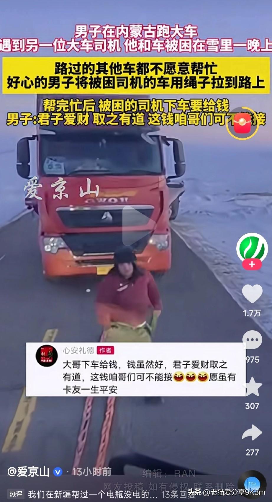 内蒙古雪夜大车救援! 内蒙古的雪夜,寒风刺骨! 一位大车司机被困雪窝,车陷在雪里一晚上,绝望啊! 路过的车一辆接一辆,却没人愿意停下帮忙……这时候,一位好心的哥们路过,二话不说,抄起绳子就把被困的车硬生生拉到路上! 被困司机下车就要掏钱感谢,结果这哥们直接甩出金句:“君子爱财,取之有道!这钱咱哥们可不能收!” 好家伙,这话说得太敞亮了!不图回报,就图个“咱哥们能平安就行”! 网友瞬间炸锅:“这才是真爷们!”“内蒙古汉子就是实在!”“这福气,必须点赞!” 想想看,大雪封路,谁不怕麻烦?但人家愣是把“雪中送炭”刻进了骨子里! 有人问:为啥不拿钱? 这哥们的回答绝了:“咱跑大车的,都懂这份苦!今天帮别人,明天别人帮咱!钱是赚不完的,良心不能丢!” 一句话,道尽了江湖义气,更道尽了中国人的善良本色! 为这善良的哥们疯狂点赞! 你尽管善良,福报都在来的路上! 同意的转起来,让这份雪夜温暖刷爆全网! (文章素材来自爱京山,侵删)