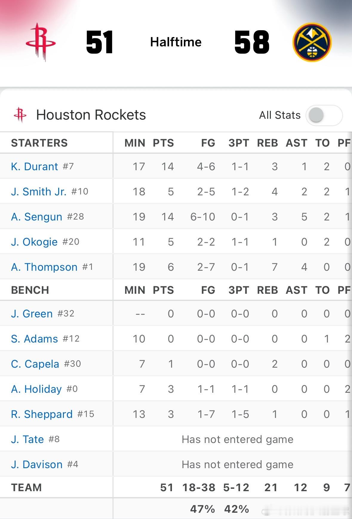 半场结束,火箭51比58暂时落后掘金!!!申京、杜兰特各拿14分🔥裁判你下半场做个人吧,不过火箭自己也要控制好失误,半场失误已经有9次了!!火箭vs掘金休斯顿火箭休斯顿火箭