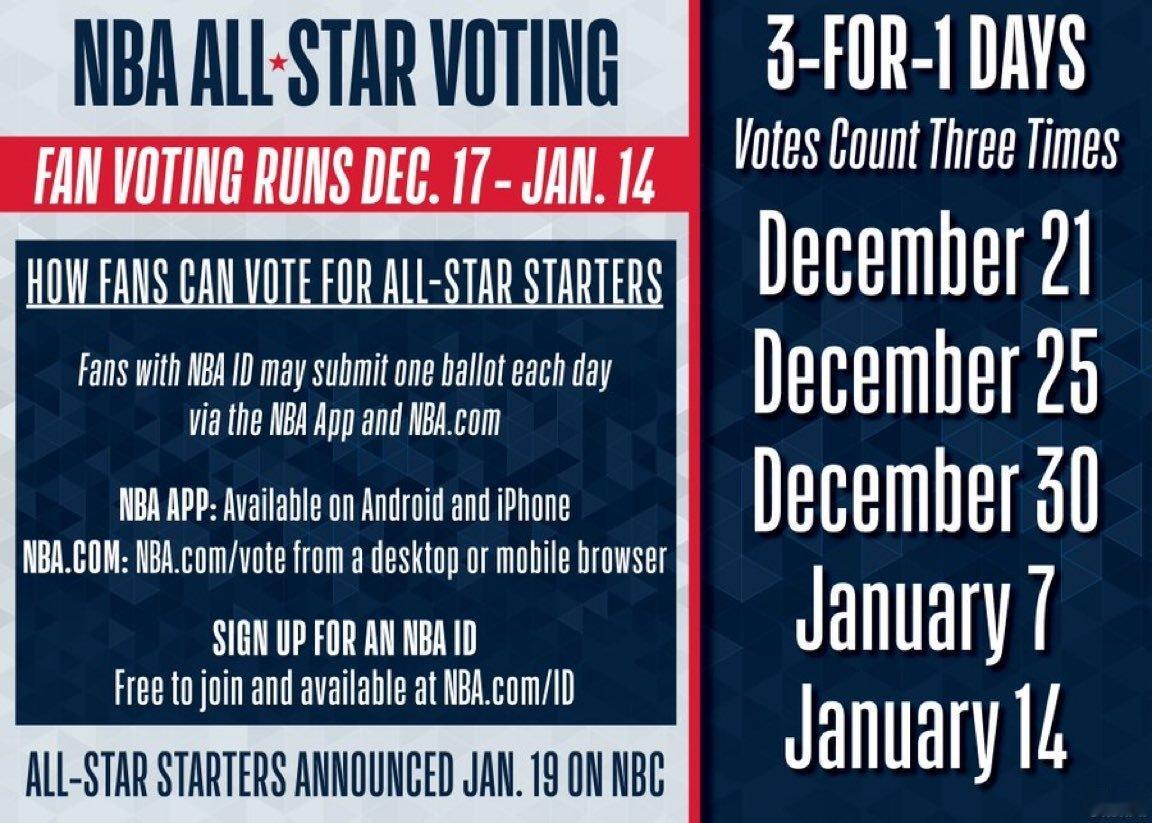 今日NBA官方宣布,本赛季全明星投票将于北京时间12月18日正式开始,截止时间为1月15日。三倍投票日为:12月22日、12月26日、12月31日、1月8日、1月15日。本赛季全明星将开启美国队VS世界队的全新赛制,今年的24位全明星将不按位置区分进行选人。