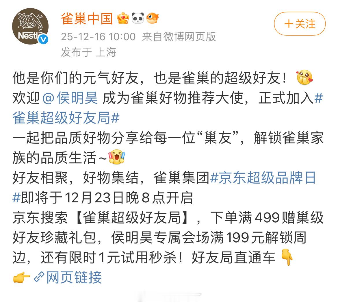 恭喜侯明昊解锁新商务,官宣雀巢好物推荐大使,小猫哥商业价值越来越高👍