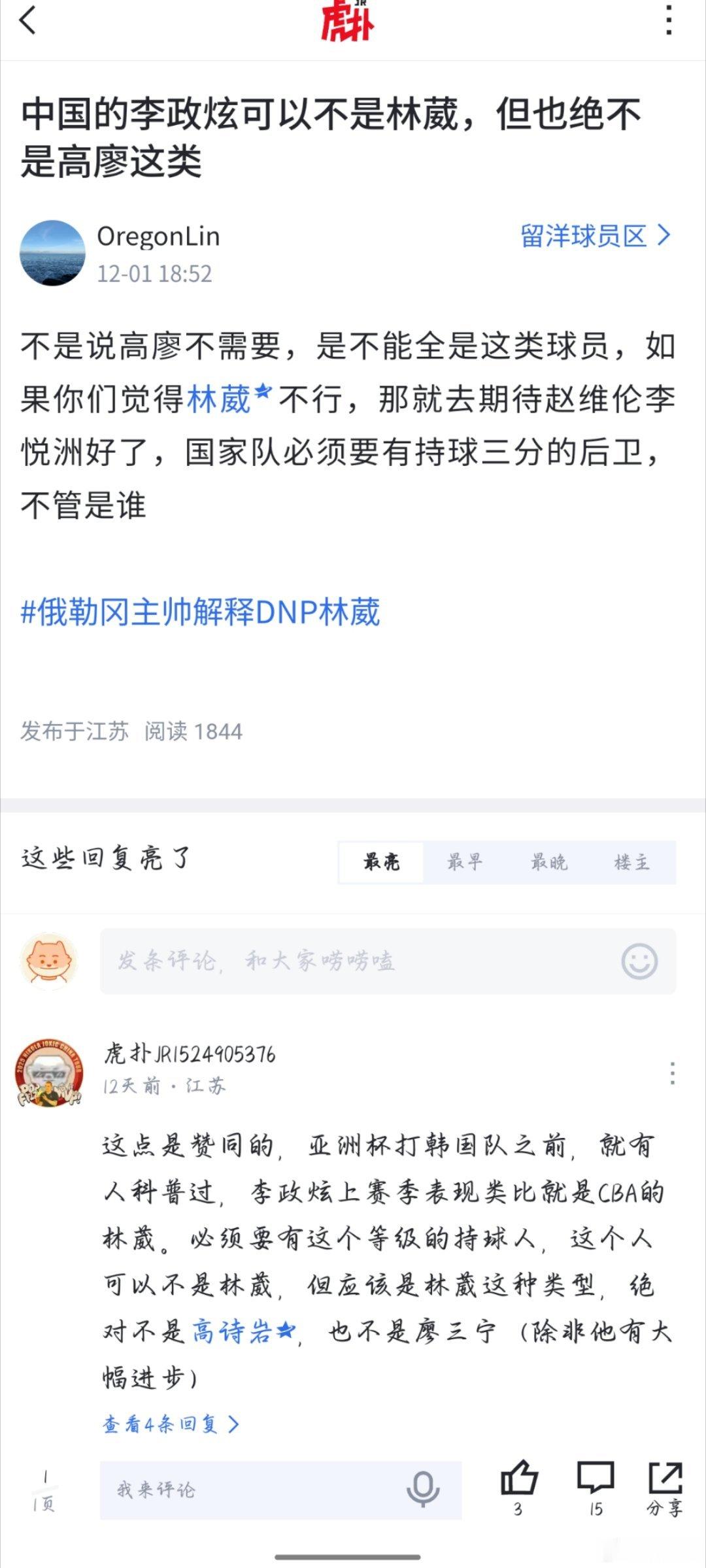 虎扑的这个网友其实说得没错,中国男篮可以不用林葳,但是队内必须要有林葳这类型的球员,能够持球投三分的后卫或前锋,未来可能不会是林葳,但是可能会是李悦州,朱正,赵维伦等等,亦或是北控14岁小将孙煜哲?