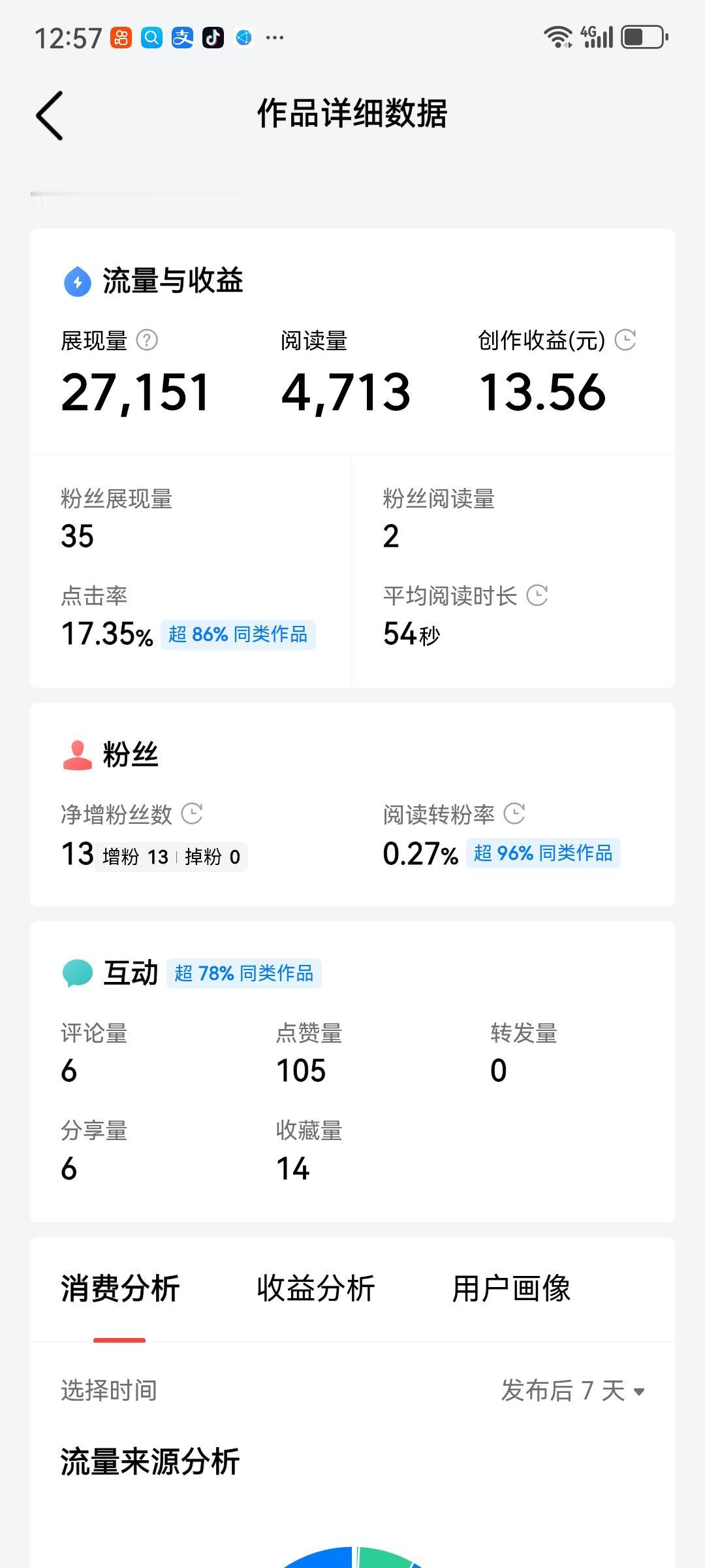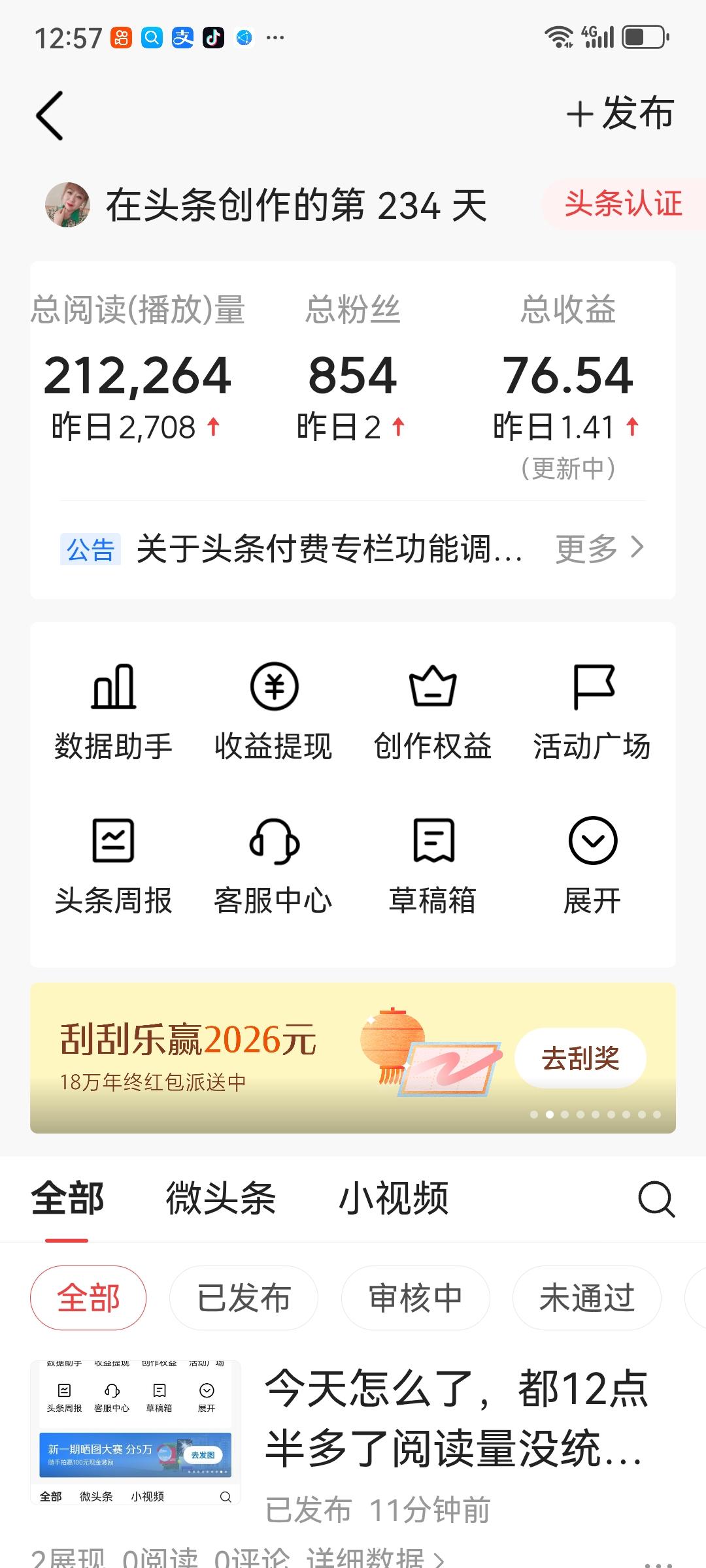 头条的阅读量的价格真的不明白,前几天的阅读量1204,收益1.32元,阅读量4713,创作收益13.56元,今天才显示2708,创作收益1.41,真不清楚是怎样计算,才看我12点多还没出现结果,才忽然就出现阅读量2708,实质量天晚上我看了一下大概阅读量三千多,真的搞不清阅读量是怎样计算的,平台计价是有标准,不能随意计价,这样时创作者是不公平的,友友们你们经历过吗,分享一下,不是钱多少的事情,平台应对每个创作都负责。我只分享一下,知道误区的原因。