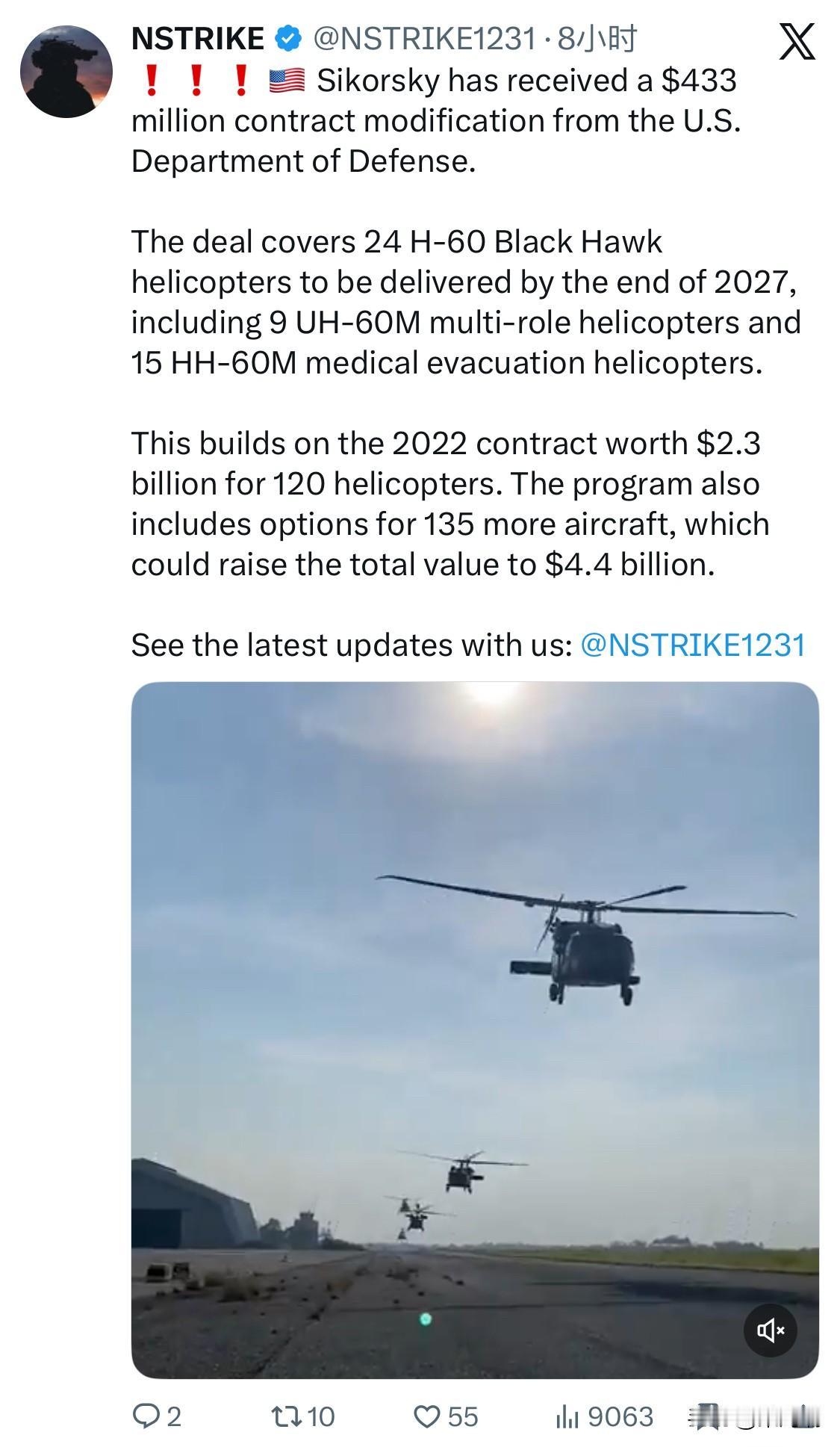 西科斯基公司已从美国国防部获得价值 4.33 亿美元的合同修改。 该协议涵盖 24 架 H-60 黑鹰直升机,将于 2027 年底前交付,其中包括 9 架 UH-60M 多用途直升机和 15 架 HH-60M 医疗后送直升机。 这项新合同建立在2022年价值23亿美元的120架直升机采购合同之上。该项目还包括增购135架飞机的选择权,这将使总价值达到44亿美元。