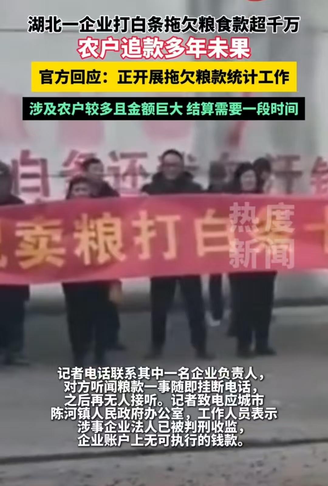 湖北,一企业打白条,拖欠农户上千万粮款,农户追讨10年无果,多名种粮大户在公司现场燃放烟花表达不满。最后,相关部门表示,已在对这些拖欠款项对应的欠条进行核对统计,由于涉及金额巨大、涉及人数众多,还需要一段时间才能完成统计工作。 2024年12月15日,湖北孝感应城市陈河镇,一位男子手里攥着张十年前的欠条——正是这家涉事企业湖北富水河粮油食品股份有限公司打的粮款白条,金额磨得看不太清,却把他整整拴了十年。 他是当地小有名气的种粮大户,流转了上百亩土地耕种,当年那次卖粮也是他全年收成的大头。 那年稻子刚收完,他跟村里几十户农户一起,拉着满车稻谷去了镇上的富水河公司。 公司门口挂着“高价收优质稻谷”的红横幅,负责人拍着胸脯说“肯定不欠大家一分钱”。 等稻谷过磅卸完,财务却递来张纸片,说“公司暂时周转不开,过阵子准给结”。 他当时心里有点犯嘀咕,但看身边农户都接了欠条,想着这是镇上的粮油公司,总不能赖账,就把印着公司公章的欠条小心折好收了起来。 可等到年底,公司里再也找不到当初的负责人,电话也打不通,钱自然没结上。 这一找,就是十年。他记不清跑了多少趟镇政府,多少次在公司门口等着,就盼着能有个说法。 那些年追款的日子里,有过着急上火的时候,也有过失望无助的时刻,可每次摸到口袋里的欠条,又觉得不能就这么放弃——这是他起早贪黑种了一年的粮,是一家人的辛苦钱。 村里不少农户渐渐没了心气,有人把欠条塞在抽屉角落再也不管,有人低价转给了催收公司,可他一直把这张欠条当回事。 家里的柜子里,除了重要证件,就单独放着这张欠条。每年秋收后,他都会把欠条拿出来展平看看,心里既盼着能突然接到结账的通知,又怕这份期盼最后落了空。 有好几次,家里急着用钱,他都差点想算了,可一想到种粮的不容易,又咬牙坚持了下来。 上个月,他听说村里有种粮大户因为追款没结果,在公司门口放烟花表达无奈,便也揣着欠条赶了过去。 看着烟花炸开又消散,他忽然觉得,这十年的等待实在太漫长了。 可当记者找到他时,他还是把欠条递了过去,不是想博取同情,只是希望“能有人管管这事,别让农户的血汗白流”。 记者后来尝试联系企业一位负责人,对方一听是要账的,当即挂断电话,再也无人接听。 更让人无奈的是,查询信息显示,涉事企业名下已没有任何可执行的现金和财产,且多名企业负责人早已被列为失信被执行人,被限制高消费。 如今,欠条上的字迹已经褪了色,但红色的公章依旧醒目。他把欠条重新折好,仔细收好。 “现在政府说在统计拖欠的粮款,我也不奢求马上拿到钱,”他望着村口的稻田,眼神里有一丝藏不住的期待,“就是希望这张白条别再成了没人管的死条,希望村里的人以后卖粮,能当场拿到现钱,不用再像我这样等十年。” 12月15日傍晚,陈河镇政府的工作人员给他打了电话,说拖欠粮款的统计工作正在推进,会一个个核实农户的欠条信息。 挂了电话,他又一次拿出那张欠条,傍晚的霞光落在纸上,给这张承载了十年期盼的纸片,镀上了一层柔和的光。他慢慢把欠条收好,心里想着:这次,应该能等到结果了。 一、企业拖欠粮款多年,除偿还本金外,还需承担其他法律责任 《粮食流通管理条例》第十一条规定,粮食收购者应及时支付售粮款,不得拖欠; 《民法典》第六百二十六条明确,买受人应按约定支付价款,逾期付款需承担违约责任。 企业不仅要还拖欠本金,还需支付多年逾期利息(按约定或法定标准计算);若存在恶意拖欠、转移财产等情形,还可能被列入失信名单,限制经营活动。 二、农户多年追讨未起诉,是否已过诉讼时效? 《民法典》第一百八十八条、第一百九十五条规定,普通诉讼时效为三年,权利人向义务人主张权利、向相关部门信访等,可导致诉讼时效中断并重新计算。 农户多年来持续追讨、找政府反映情况的行为,已构成诉讼时效中断,未丧失胜诉权。只要保留好催款记录(如通话记录、信访凭证),仍可向法院起诉。 三、种粮大户燃放烟花表达不满,不合法 《治安管理处罚法》第二十三条规定,扰乱公共场所秩序的,可处警告、罚款或拘留; 燃放烟花若扰乱公共秩序则涉嫌违法,可能面临行政处罚。合法途径包括:向当地粮食主管部门或信访部门投诉、申请调解、凭欠条起诉并申请强制执行。 四、相关部门称“金额大、人数多需时间统计”,不能无限期拖延 《保障中小企业款项支付条例》第二十一条规定,县级以上政府部门应加大拖欠款项清理力度,建立督办机制; 《行政效率监督条例》要求行政机关公开办事时限。 统计工作需合理时限,但不能无期限拖延。相关部门应公开统计进度和预计办结时间,农户可要求其出具书面处理方案,对不作为可向上级部门投诉。 对于此事,大家如何看待?素材来源于热度新闻,2025年12月15日