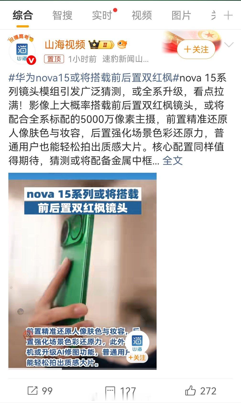 华为nova15或将搭载前后置双红枫前摄加上红枫就是绝杀了,因为对这个群体来说前摄自拍还是很重要的。不止是前后双红枫,听说前后的CMOS也都升级更大底了。华为nova15有望迎来全系大升级