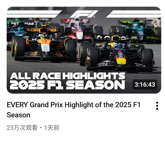 F1官方油管把2025赛季的每场正赛集锦拼在一起,发了一个长达3小时16分42秒