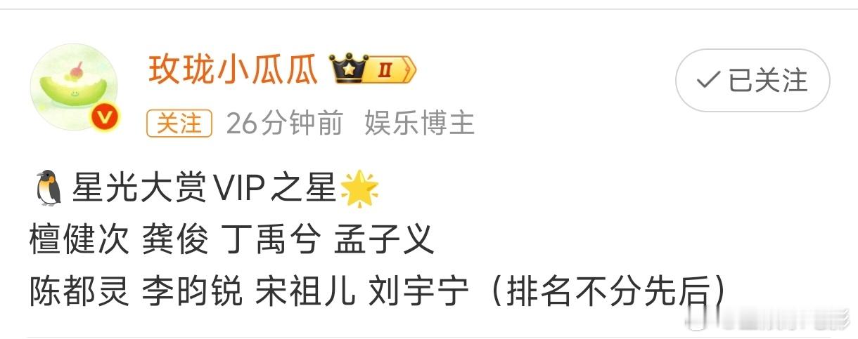 星光大赏vip之星最终名单网传星光大赏vip之星最终名单:檀健次、龚俊、 孟子义, 陈都灵 ,李昀锐 ,刘宇宁 ,丁禹兮 ,宋祖儿。说是赵露思有别的奖项安排!网传星光大赏vip之星最终名单