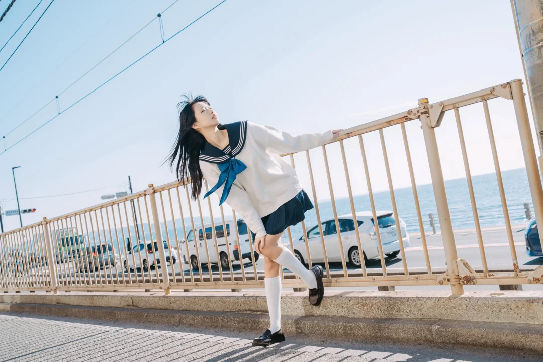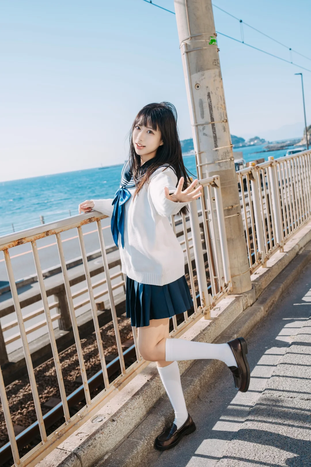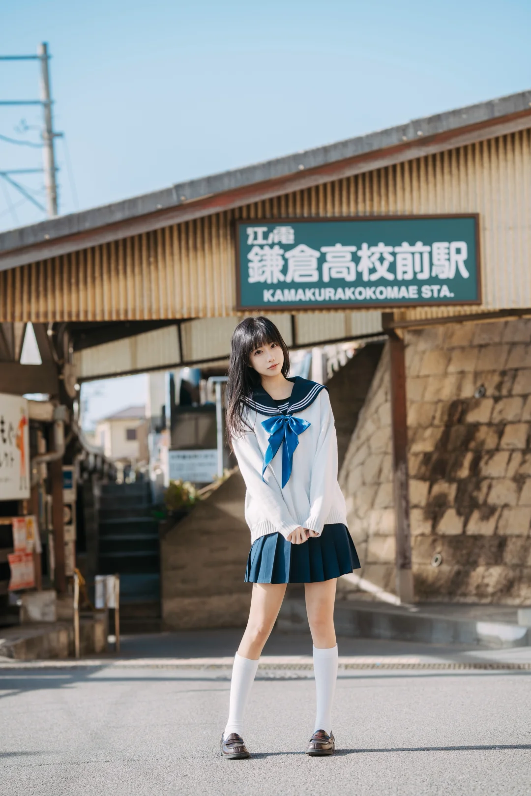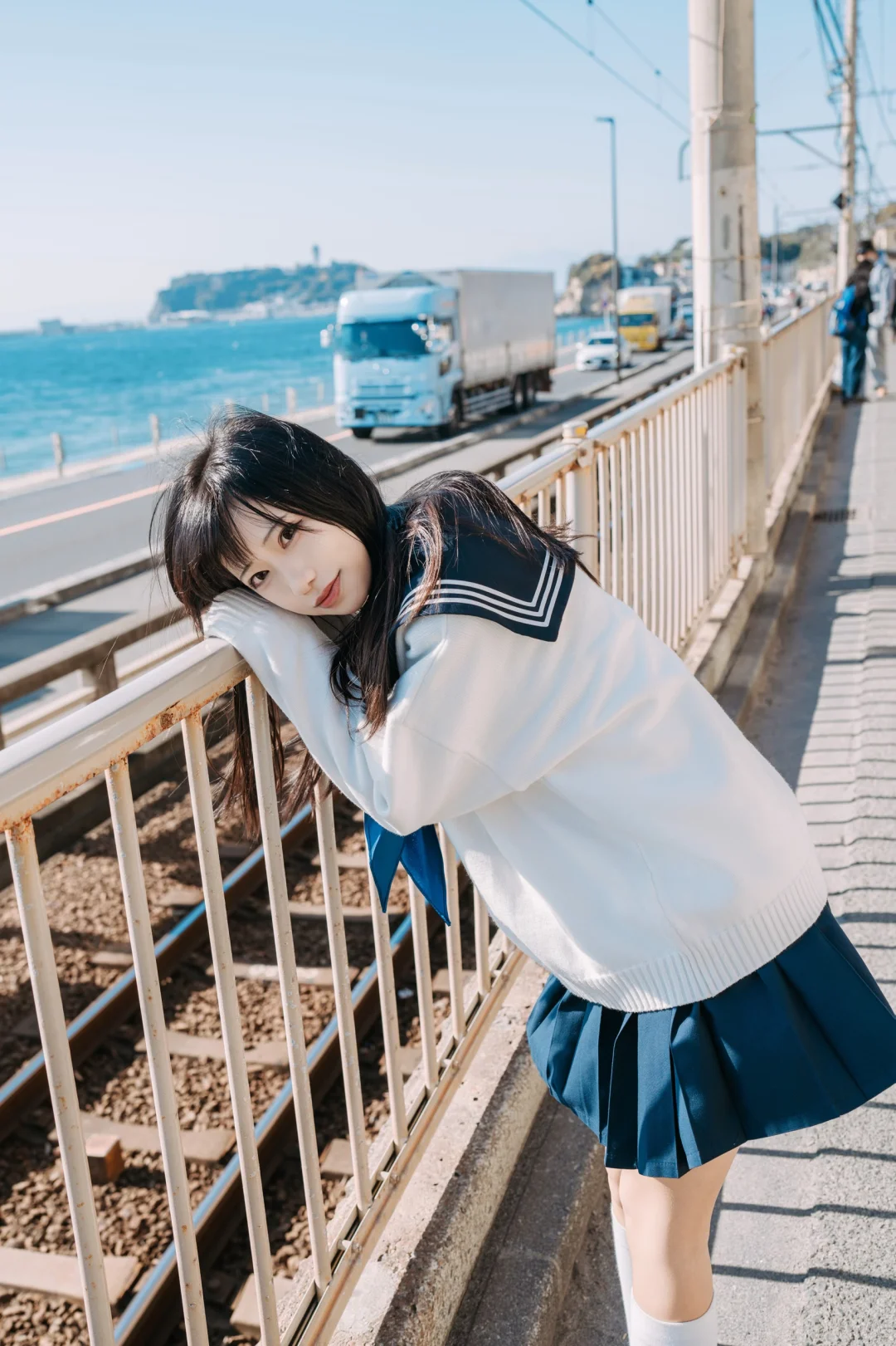 [一R]站点上坡路段:车站出来会看到一个上坡路,找个地势稍高的位置,能拍到电车+海岸线同框,还能避开人群!
