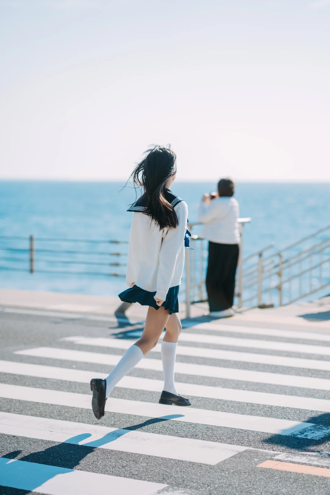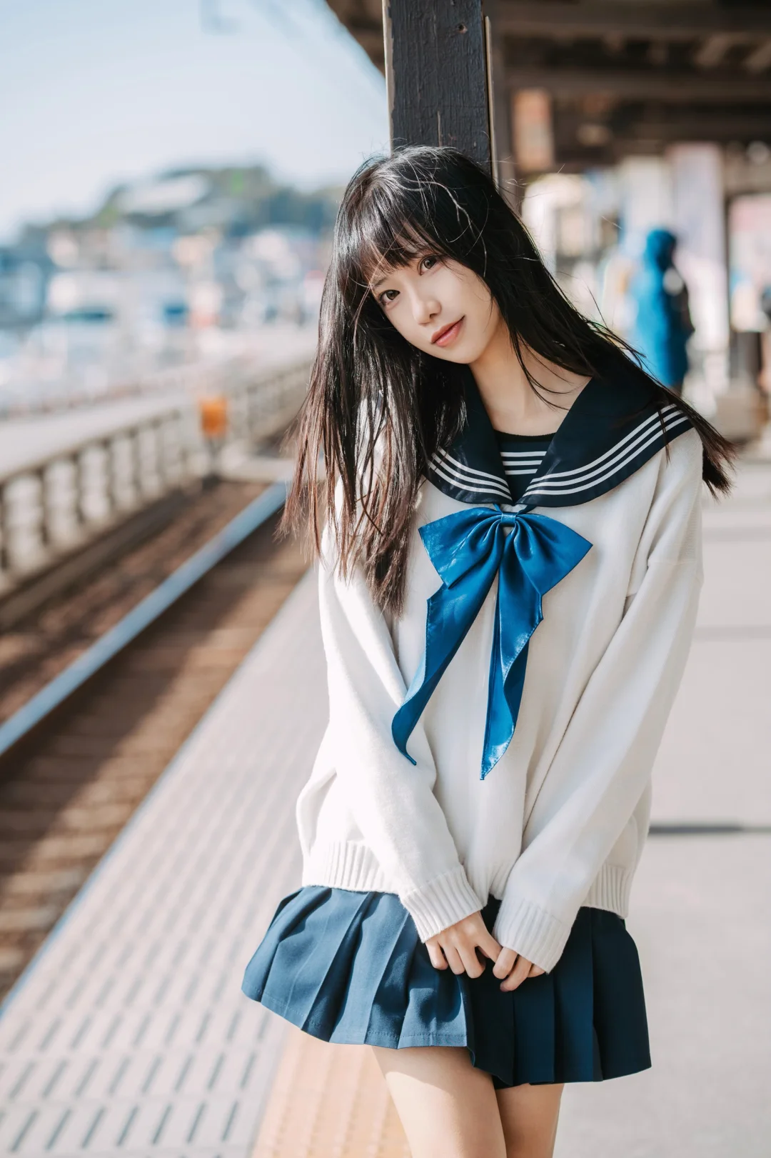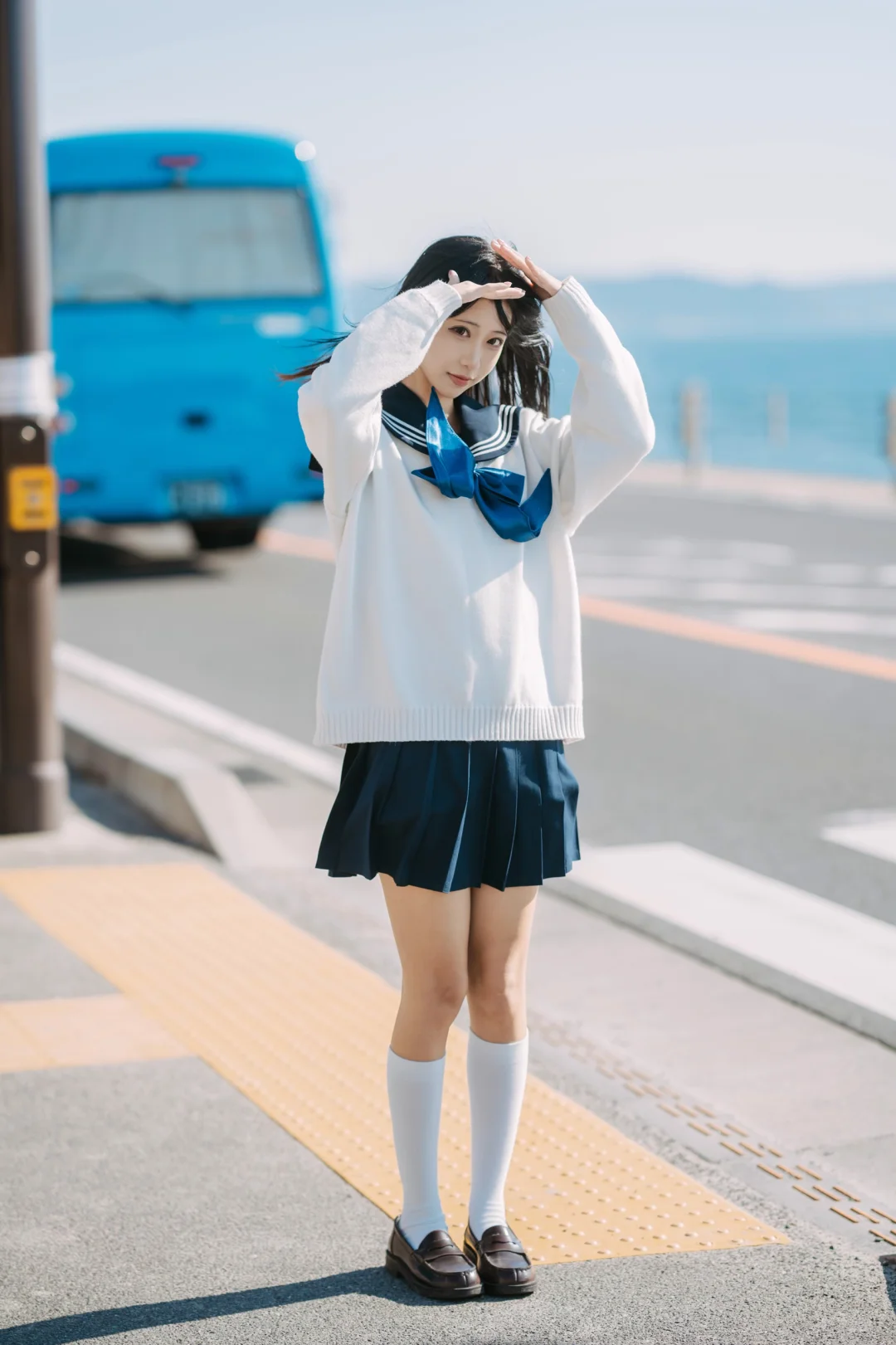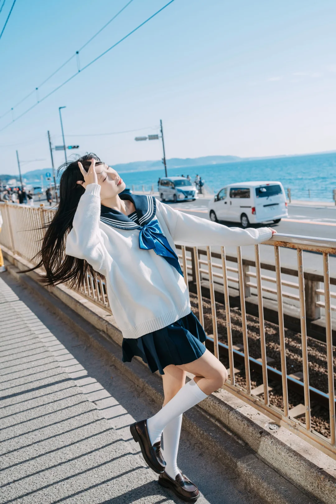 [一R]站点上坡路段:车站出来会看到一个上坡路,找个地势稍高的位置,能拍到电车+海岸线同框,还能避开人群!