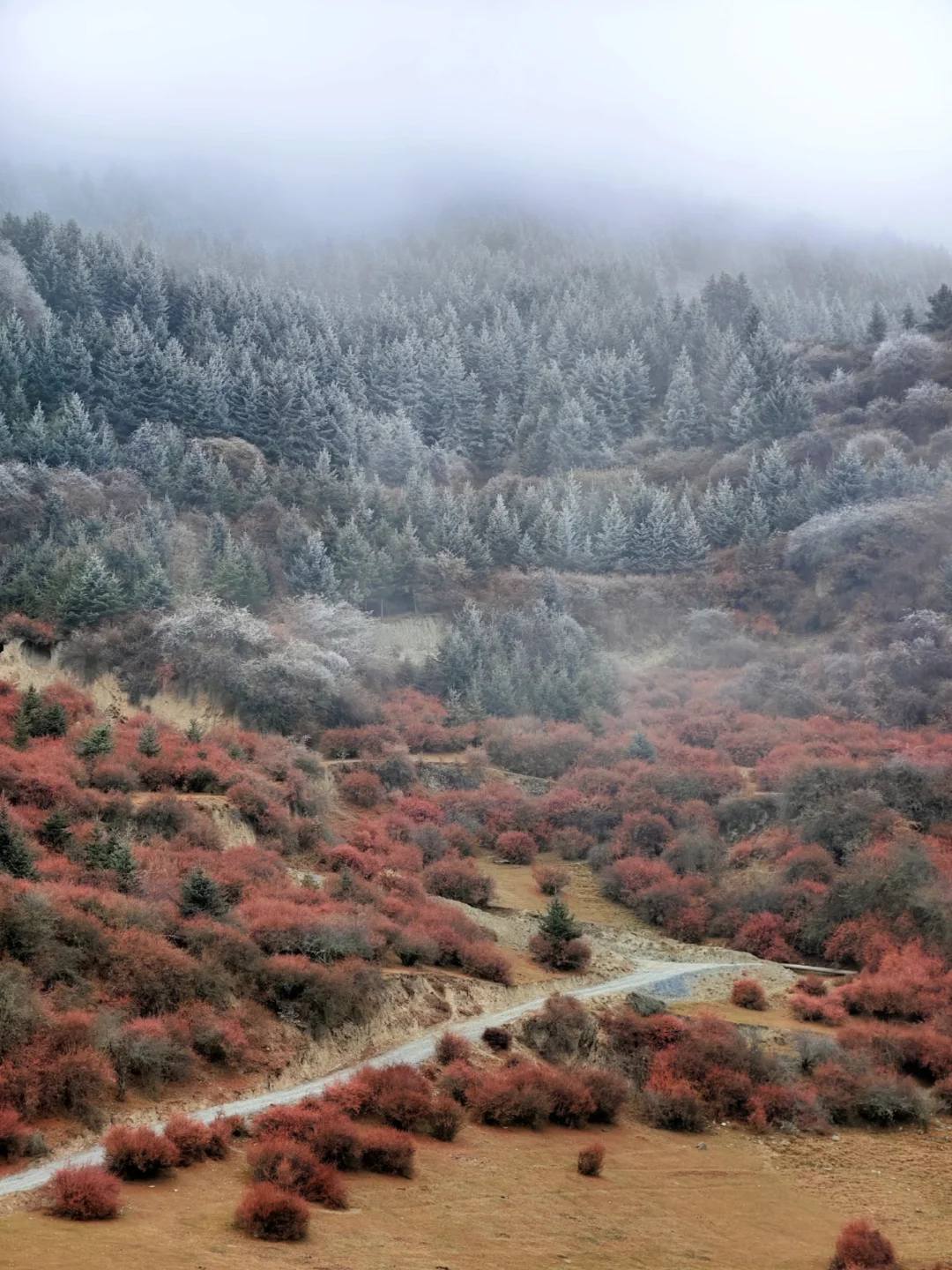视野开阔,草甸铺就的绿毯平地,还有依山势分布的“圣诞树”版的松树点缀其中,马匹悠闲觅食追逐,远处雪山在光影的变化下更显生动,冬日早晨还可以看到雾凇,此刻深切感受到山河静美,灵魂自由。
