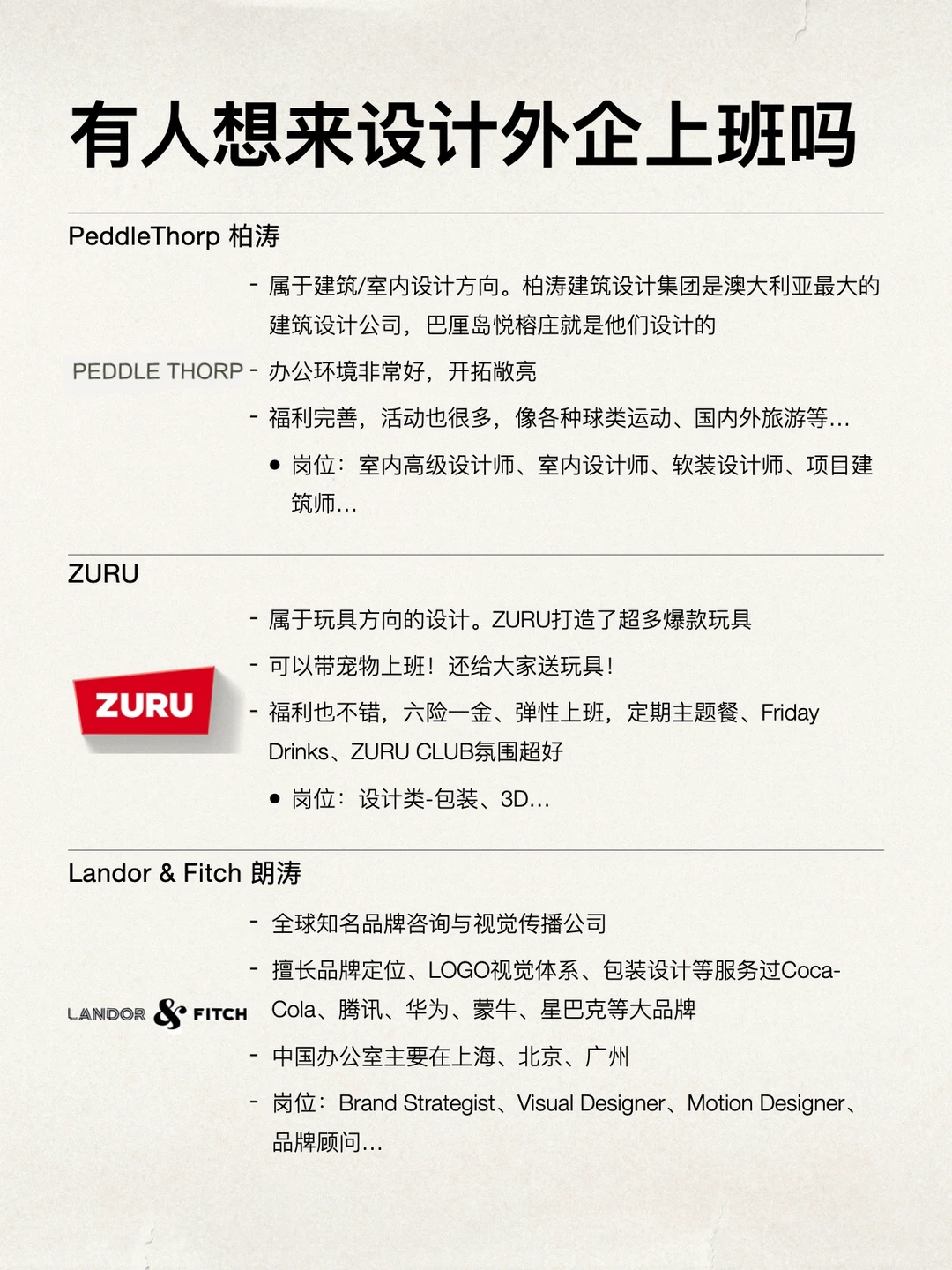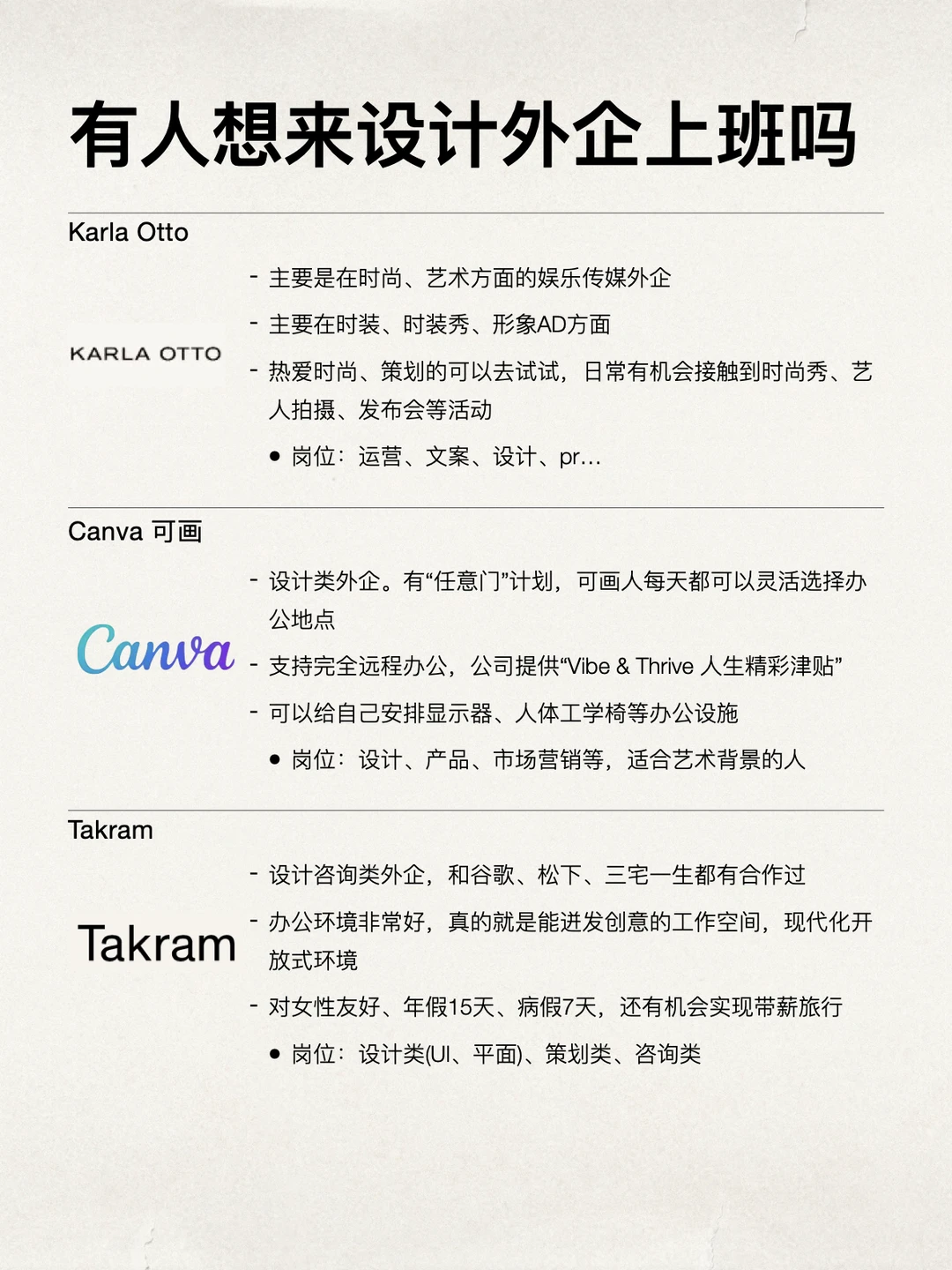 这次整理的都是偏设计、创意方向的外企,比如 Canva、Karla Otto、Takram ,很适合审美好、有视觉表达和创意能力的人 . 岗位基本上都是视觉设计、品牌设计、内容创意、创意策划类的,当然也有些职能支持岗位。整体女生友好度很高,氛围比较舒服,而且很多项目都很有意思,经常会有一些活动、有线下、有展览这些。 . 福利这一块也没得说,基本上都是 955、双休、年假 10–15 天起、弹性办公或远程,像可画还支持完全远程 . 如果你是艺术生,或者本身对视觉、设计、创意这些感兴趣,又想去那种压力小一点的环境,其实这类设计外企真的不错~ . 坚持日更✊🏻,对外企感兴趣的欢迎常来看看 .