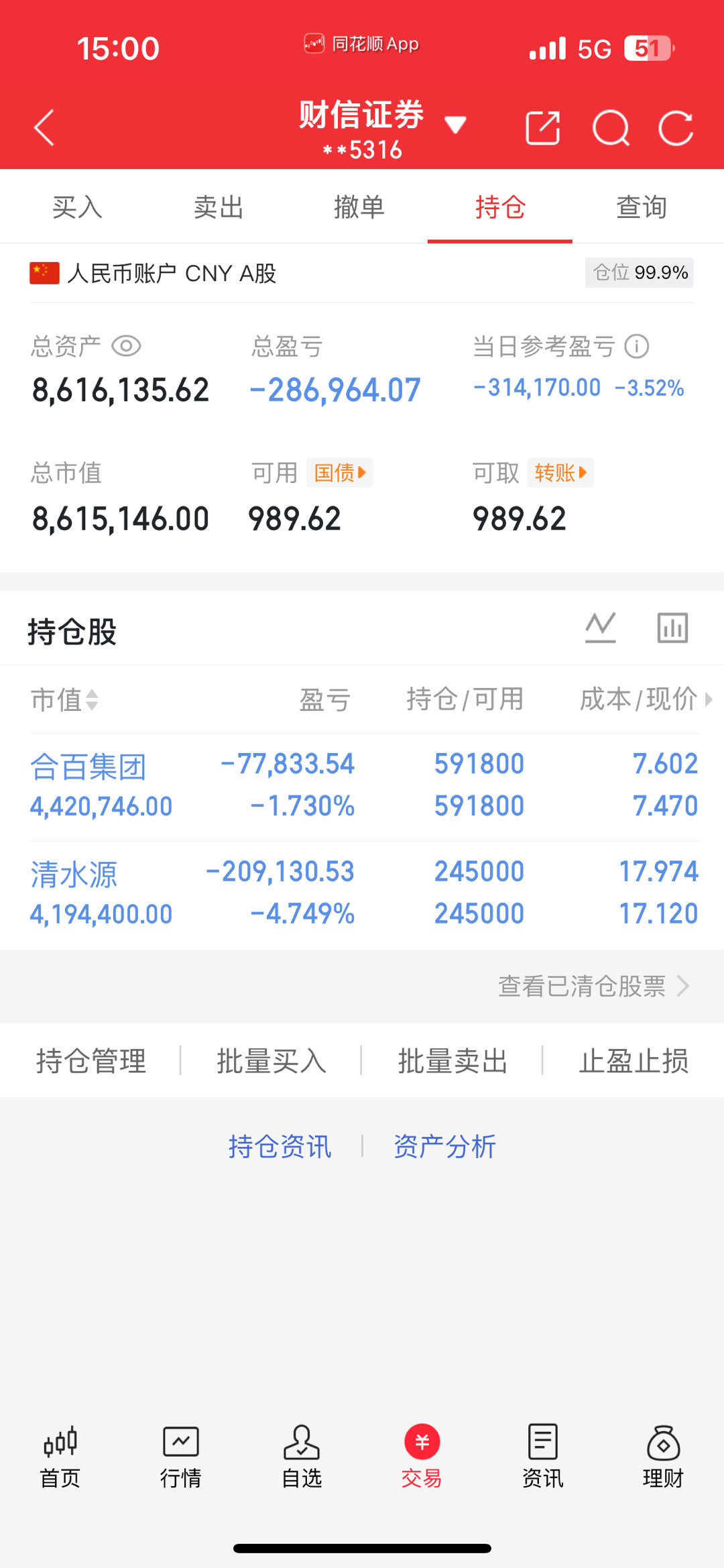 今天是12月16号星期二!菲菲股票操作之旅;继续持有:合百集团,清水源特别声明:我开实盘的目的主要是为了记录我对A股走势的思考和研判,并用于记录我自己的操作笔记,是我积累股票投资知识和反省操作失误的一个平台,绝不是读者朋友买卖股票的依据和理由,不具备投资建议,据此操作,需自行承担投资后果,股市有风险,投资需谨慎!!!看到的朋友点个赞,扣一波“888”支持菲菲,我会每天坚持发出自己的操作来!兄弟们,点赞富三代,评论美一生!
