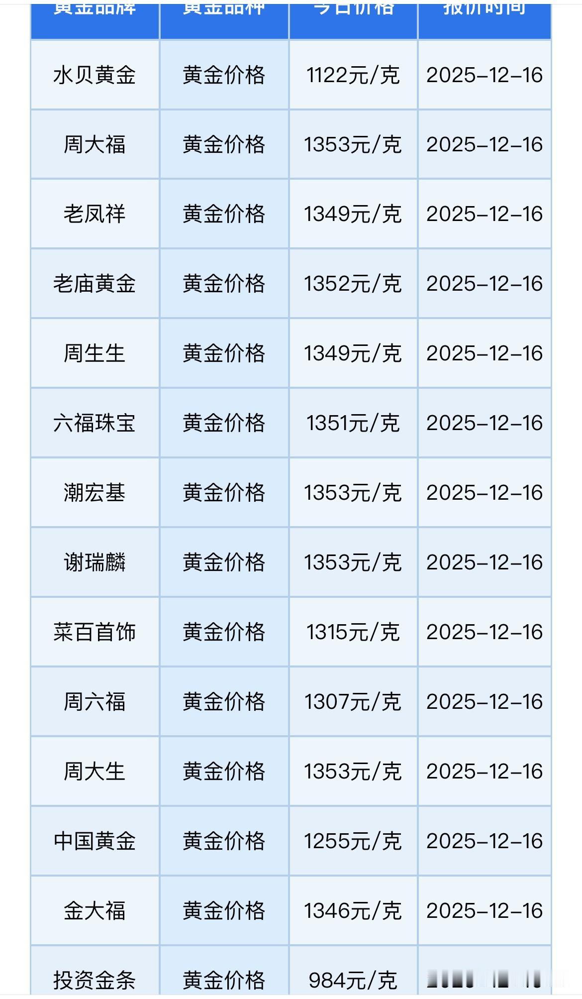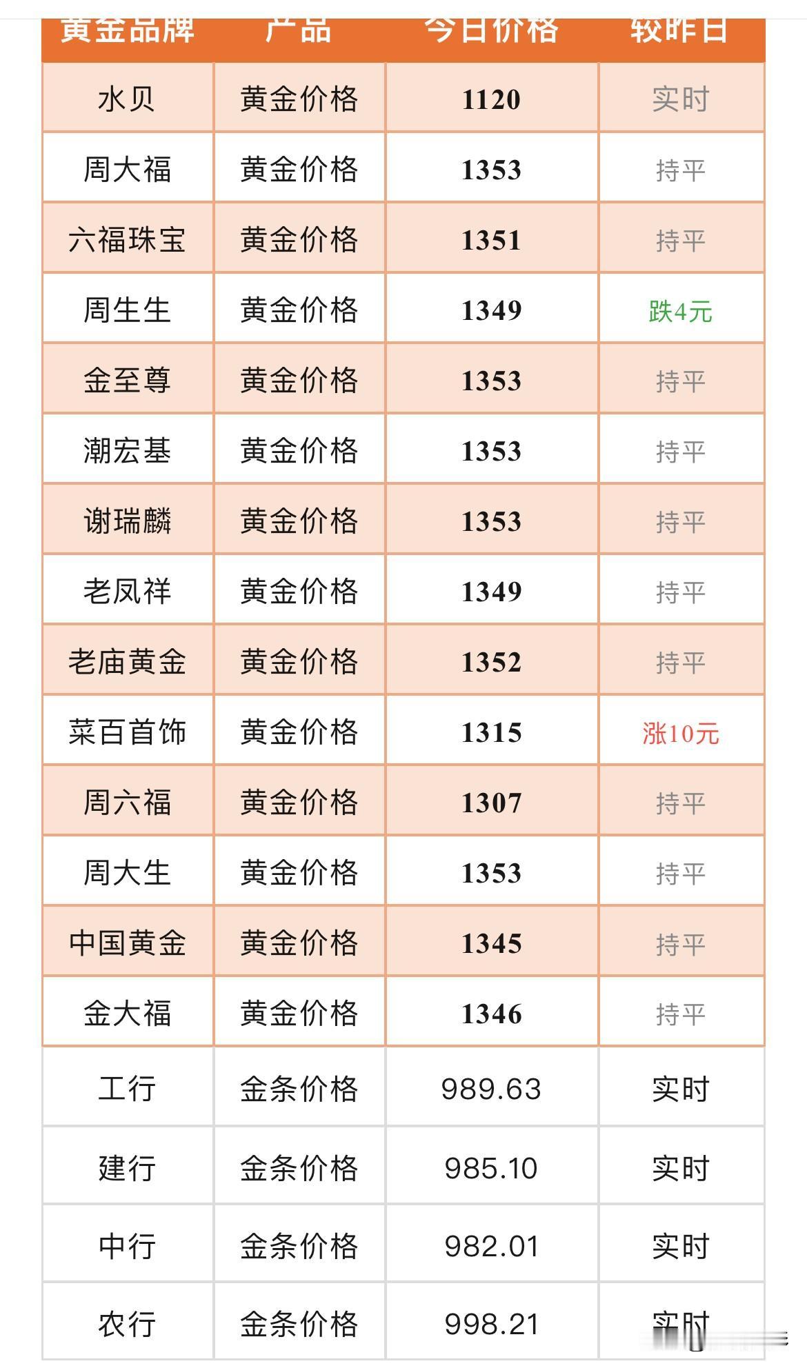 看看 黄金首饰价格出来了! 周大福黄金价格1353元/克, 老庙黄金黄金价格1352元/克, 周生生黄金价格1349元/克, 菜百首饰黄金价格1315元/克, 六福珠宝黄金价格1351元/克。 同比与昨天黄金首饰价格周大福、老庙黄金、六福珠宝保持平稳,周生生有所回落,跌了4元。反而菜百首饰上涨了10元。还有其它都金店首饰都是持平。 今日黄金首饰价格每克基本都在1122元到1353元区间(工费另计) 所有信息都只是提供参考价值! 购买黄金有风险,请大家理性购买! 黄金售卖价格 黄金价 黄金一克720 足金金饰价格 黄金价格680 金饰价