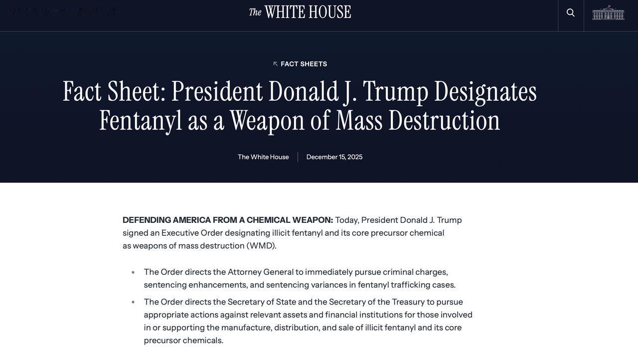 白宫12月15日发布情况说明称,特朗普已签署总统行政令,将非法芬太尼及其核心前体化学品指定为大规模杀伤性武器(WMD),把芬太尼问题正式上升为国家安全与化学武器威胁。行政令要求司法部在相关案件中立即寻求刑事起诉,并争取更重量刑;同时指示国务院与财政部对参与或支持芬太尼制造、分销和销售的资产与金融机构采取行动。同时,政府还要求国防部门、国土安全部与司法部加强在“WMD紧急情形”下的协作,将芬太尼威胁纳入化学事件应急与情报识别体系。白宫表示,将芬太尼定性为WMD,旨在全政府集中应对这一被称为“化学武器级威胁”的毒品问题。 图片来源于网络